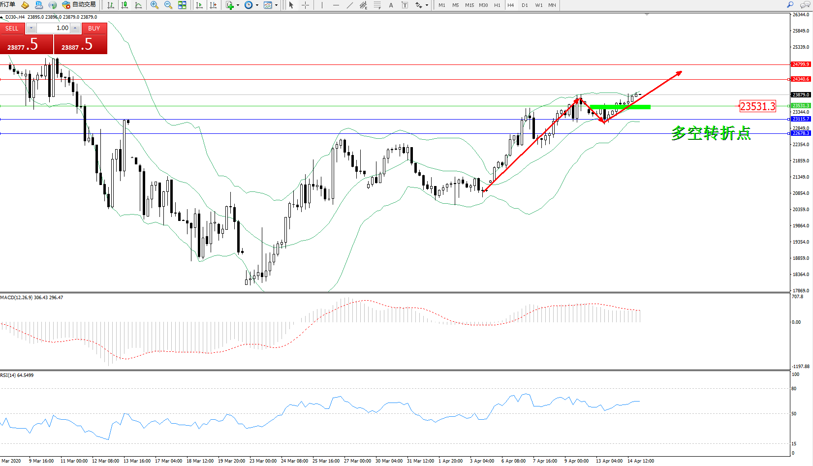 道琼斯指数4月14日(周二)收盘上涨559.00点,涨幅2.39%,报23949.76点。周二美国股市上涨,因有迹象显示冠状病毒疫情正在平稳或缓和,而阴云密布的财报季首批财报即将出炉之际,交易员们也在掂量权衡。日常消费品板块领涨,其次是非日常生活消费品板块和信息技术板块;伴随着油价下跌,能源板块是唯一下跌的板块。工厂停工、供应链进一步中断以及封锁期间大多数商品的消费者需求下降,都预示着4月份经济将进一步萎缩,预计4月制造业活动总体水平较疫情前下降约25%,创二战结束以来最大的产出降幅。此外预计4月建筑业活动下降约30%。特朗普总统未来几天将就重新开放经济的指引发布“重要公告”;随后股市扩大涨幅。随着财报季的到来,投资者将了解这种流行病可能对全球公司造成的严重打击。