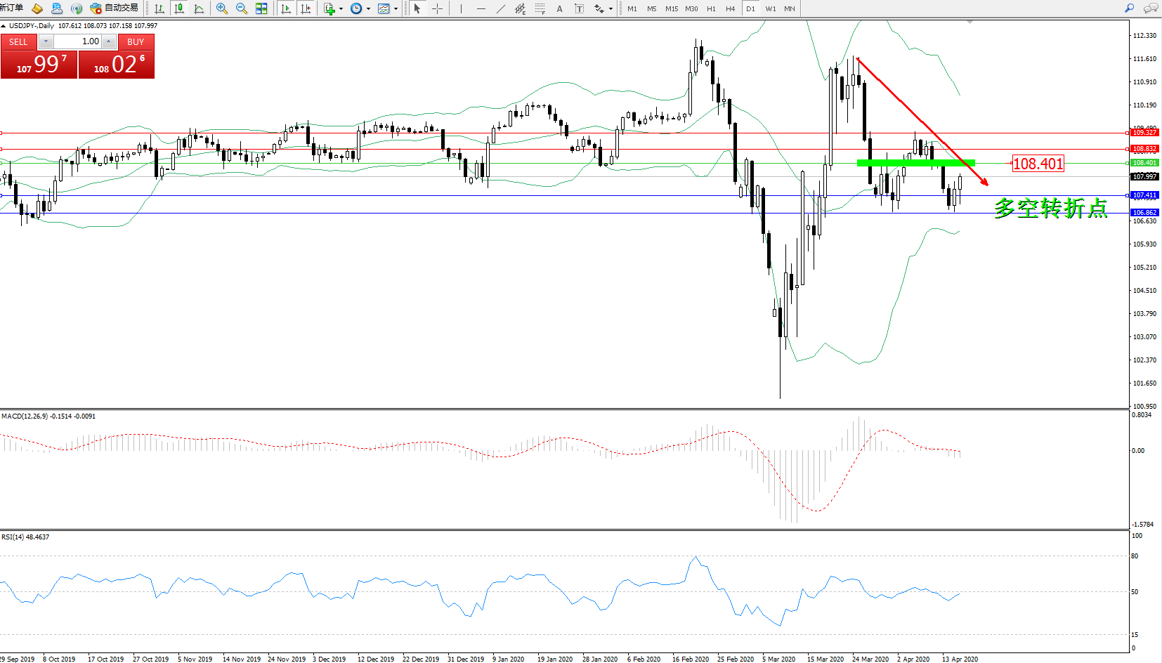 美元兑日元上涨约0.43%,报107.92;此前一度跌至107.17,美元指数上冲100大关遇阻,市场风险偏好情绪此起彼伏,一方面美元荒担忧犹在,另一方面美国经济在持续恶化,而日元避险作用也一直没有发挥出来,日本首相安倍晋三宣布将紧急状态令扩散至全国直至5月6日。并称,将调整一项补充预算草案,考虑为每位居民发放10万日元现金。国际货币基金组织驻日本首席代表布雷克(Odd Per Brekk)称,“在短期内,有必要采取扩张性财政政策来减轻新冠疫情的影响,并支持随后的经济复苏。”