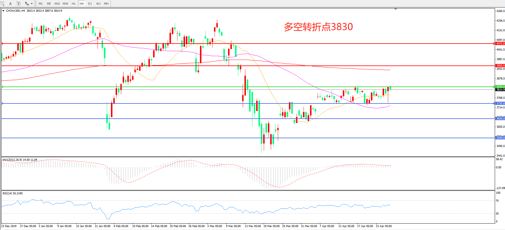 4小时图看,沪深300延续区间震荡,长下影的锤子线显示下方支撑较足, 3830成为短期阻力,均线系统走平,MACD红柱增加,RSI指标走平,日内延续上行概率较大。