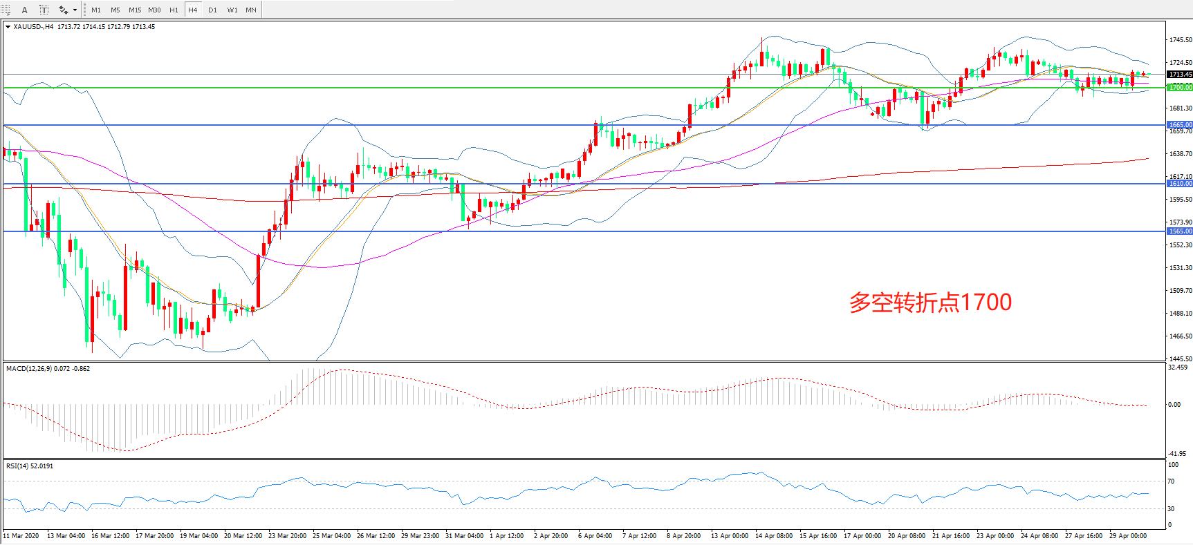 周三(4月29日),因美联储措辞略偏鸽派,美元指数短线小幅下挫,而美联储主席鲍威尔会后发言更是令金价逆势上扬,鲍威尔表示当前的公共卫生危机将在短期内严重影响经济活动,美联储对经济增长有信心,但仍将采取适当行动支持经济。