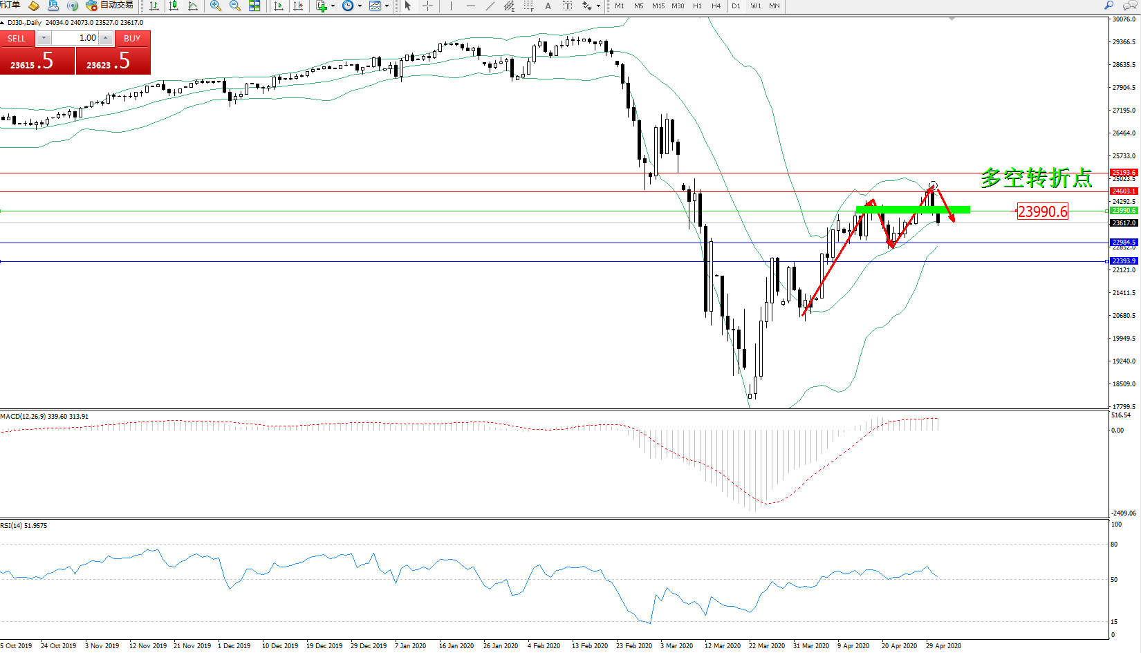 道琼斯指数5月1日(周五)收盘下跌622.00点,跌幅2.55%,报23723.69点。美国股市周五下跌,与冠状病毒有关的盈利预警以及贸易紧张关系打压了市场;此前亚马逊和苹果公司都就病毒大流行的影响发表了令人清醒的言论。美股表现较为疲弱,特朗普似乎在暗示贸易摩擦将卷土重来;听到这样的消息,许多投资者出脱了可能受此影响的各类资产,并重新投资于安全资产,数据显示美国4月份制造业产出创纪录下降后,市场的避险情绪升温。达拉斯联储主席卡普兰称,第二季度美国经济可能会折合年率萎缩30%,失业率可能会达到20%,到年底时失业率仍在8%-10%左右。
