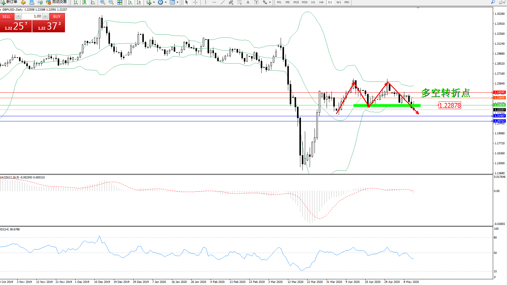 交易策略:1.22878下方看跌,目标1.21407、1.20712