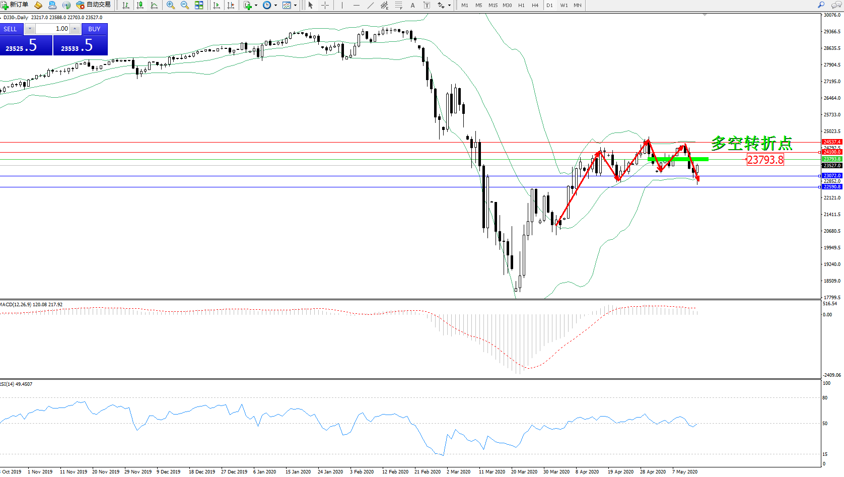 道琼斯指数514日(周四)收盘上涨377.40点,涨幅1.62%,报23625.34点。美股三大指数低开高走震荡回升,银行股超跌大涨,帮助股市摆脱了疲软经济数据和中美紧张局势所引发的悲观情绪。能源股也随油价大涨,这两个行业仍然是今年表现最差的板块,跌幅超过30%。道琼斯工业平均指数跑赢其他主要基准指数,受美国运通和思科大涨提振。疲软的就业数据和贸易局势一度拖累美股早盘大跌,一些投资者似乎开始看跌美国股市,贸易关系继续向着恶化的方向发展,来自美国的数据非常黯淡,所有这些都支持避险需求。在美国总统特朗普表示支持强势美元和发表有关中国的言论后,交易员们早些时候涌向美元;尽管数据显示上周美国首次申请失业救济人数仍然以百万计,美元依旧保持了涨势。