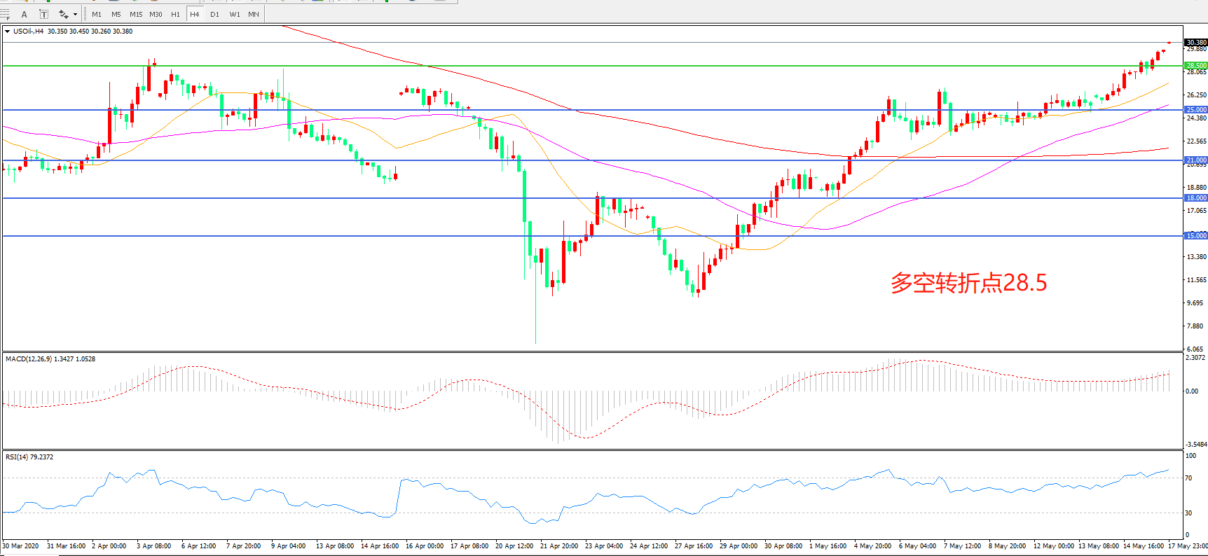 受益于全球复工开启和中国需求数据改善,上周美国WTI原油反弹近15%,收报29.70美元/桶,周一开盘后气势如虹,截止发稿前,收报30.38美元/桶。