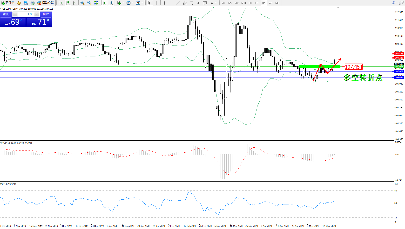 美元兑日元上涨0.34%至107.71;盘中一度触及4月13日以来最高水平108.09;关于一支试验性疫苗显示出新冠病毒免疫反应迹象的报道推动风险偏好反弹。隔夜以来美元指数整体承压,但美元兑日元汇价仍是稳中有升;原因在于推动美元走低的主因是全球风险偏好转好,而这令避险货币日元也遭遇了变本加厉的抛售。日本央行决定在本周五召开特别政策会议,内容是敲定向银行也提供更多融资便利措施的方案,此举自然被视作日本央行进一步扩大宽松力度增加货币供应量之举,这也令日元汇价额外承压。