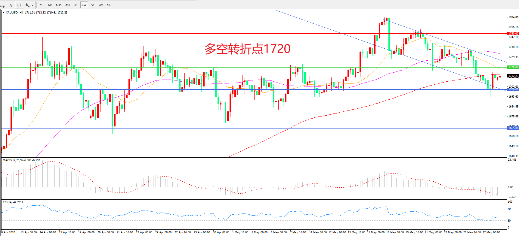 周二(5月27日),技术面的回调风险令多头开始锁定获利,现货黄金上演高台跳水,一度跌破1700美元关口,但特朗普周二表示,美国将在本周末之前宣布对中国计划中的香港国安法的响应,令市场上的避险情绪迅速回升,加上孟晚舟事件的继续发酵,金价小幅回升,收报1710.96美元/盎司。