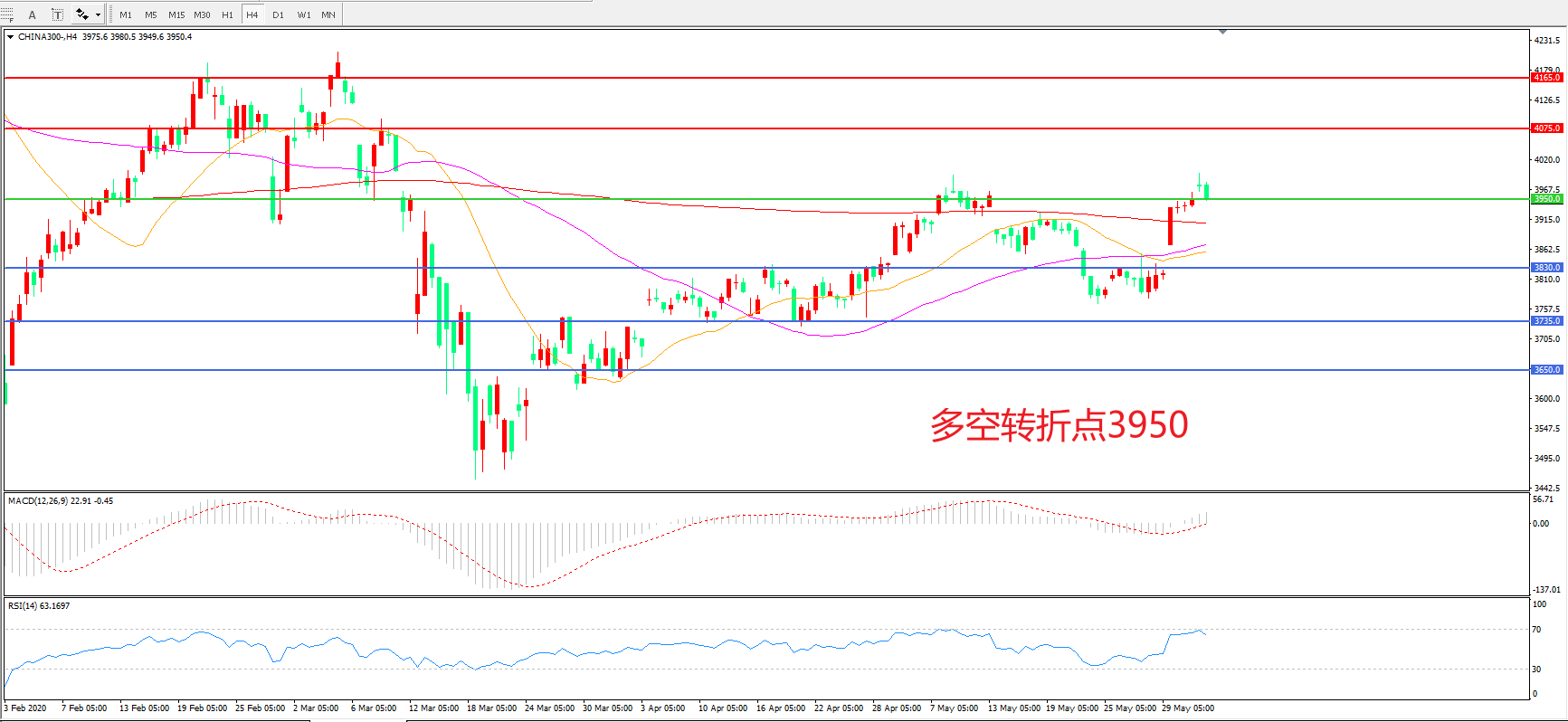 4小时图看,沪深300高开低走,再次考验上方阻力,3950成为短期多空分水岭,均线系统走平,形成支撑,MACD红柱增加,RSI指标走平,日内延续上行概率较大。