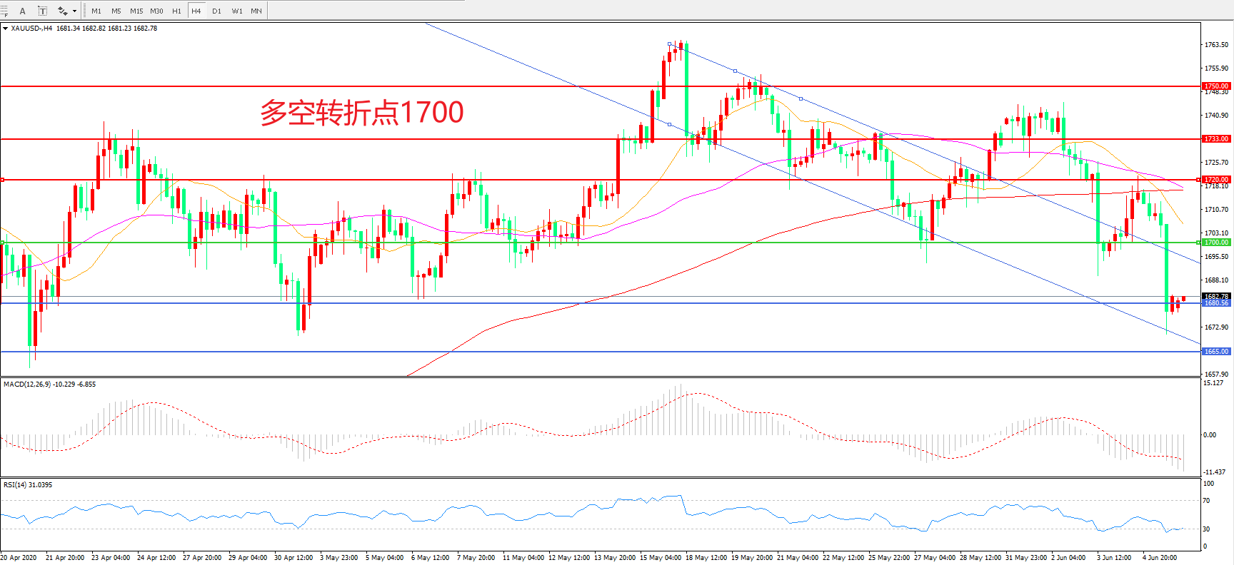 上周五(6月5日),美国非农业就业数据增加250万人,大幅好于市场预期,成为行情暴动的导火索,现货黄金直线跳水,迅速跌破1700美元,盘中最大跌幅超过3%,最终收报1682.73美元/盎司