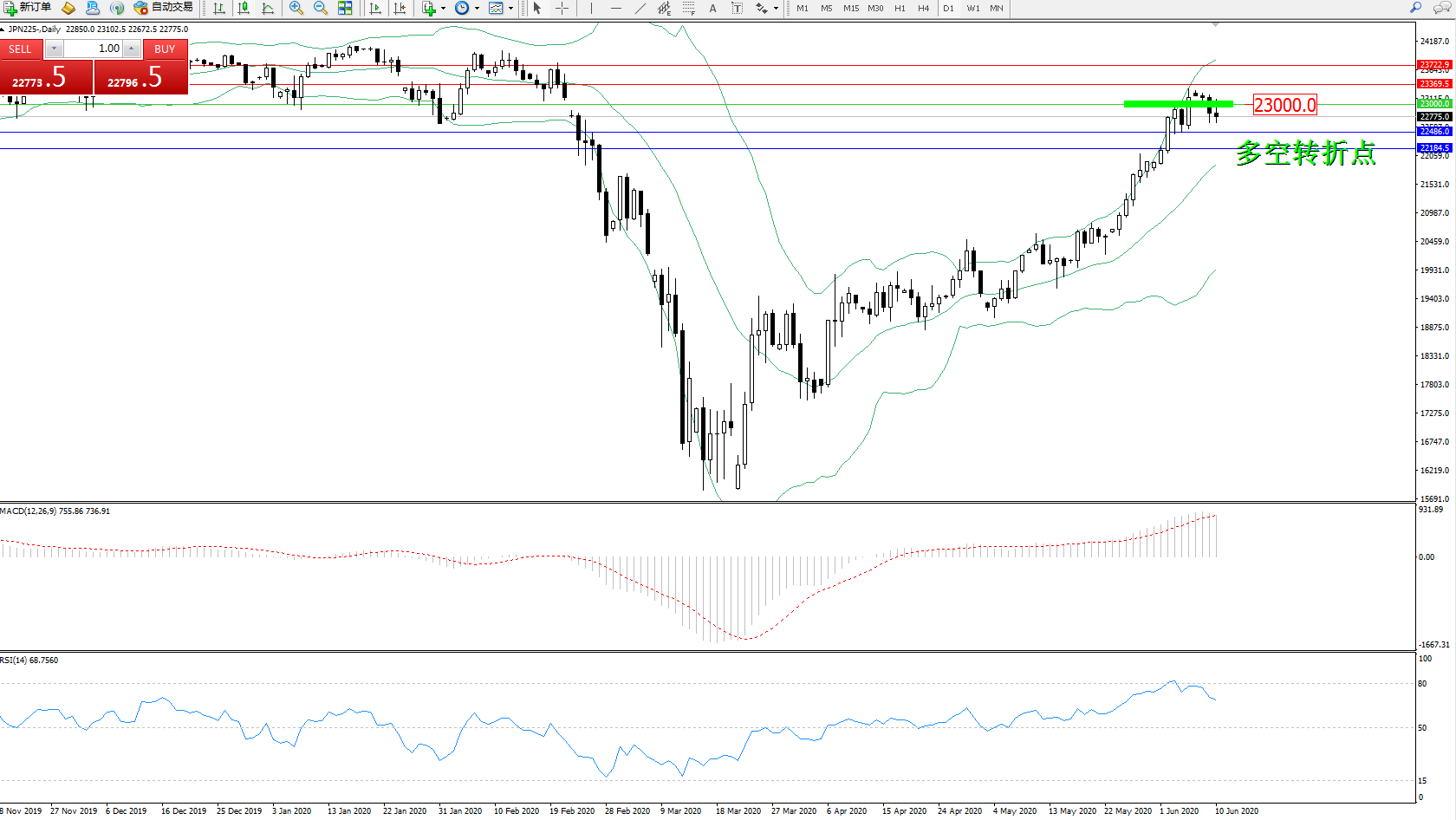 日经225指数6月10日(周三)收盘上涨14.47点,涨幅0.06%,报23105.50点。日本内阁府10日发布的报告显示,今年4月,作为民间设备投资的先行指标,日本不含船舶和电力的核心机械订单额经季节调整后环比大降12%。与上月0.4%的环比降幅相比,内阁府最新公布的4月核心机械订单降幅骤然扩大,超过各界预期。此前民间机构的平均预测值为下降8.6%。多数受访经济学家暗示,日银下周会议将按兵不动; 在受访的47位经济学家中,有72%的人预计,日本央行将在下周会议上保持政策不变;尽管预计央行不会采取重大举措,但市场预计其将以某种形式加强对企业的贷款支持。