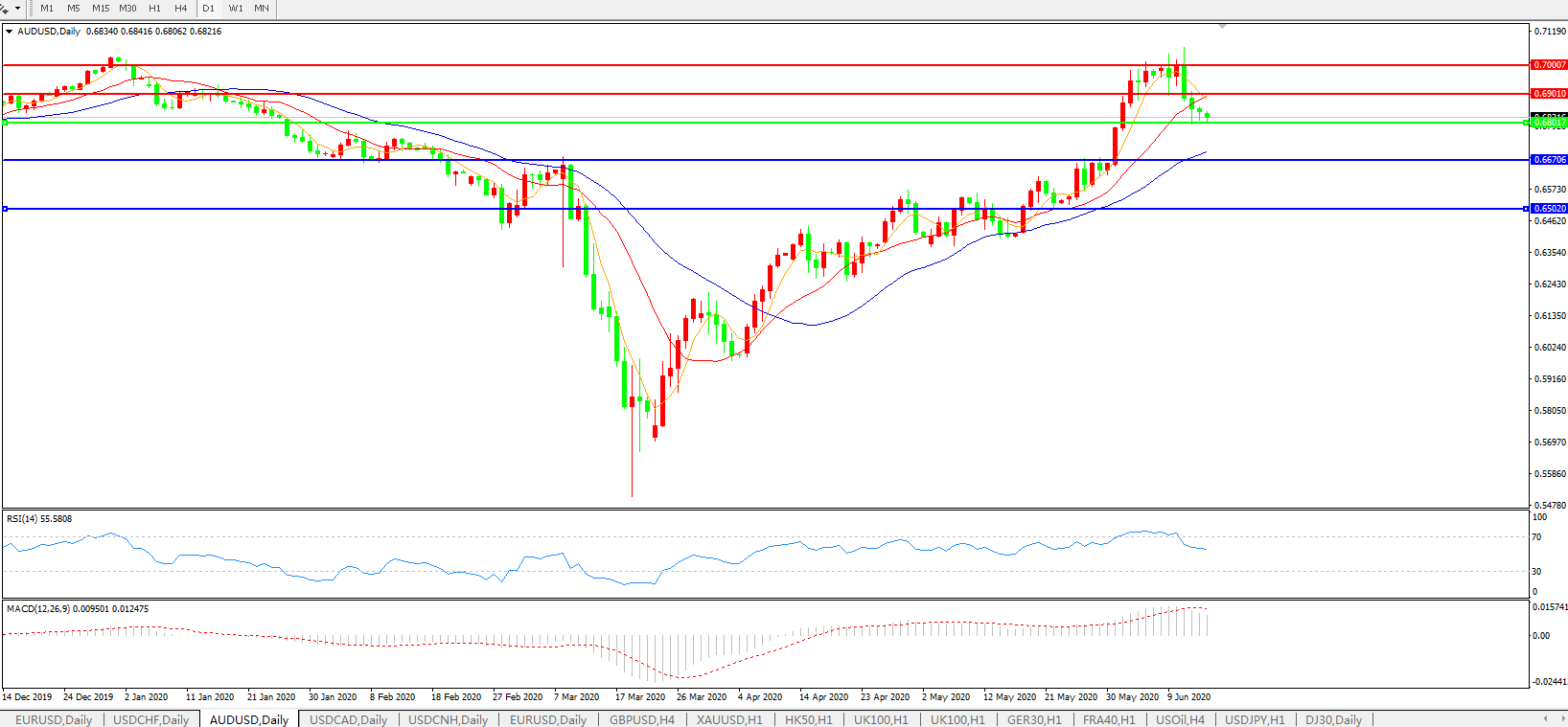 技术面简析:日图短期均线开始下穿长期均线,汇价继续小幅走低维持弱势,MACD运行于0轴上方但量能持续微缩量,RSI自高位持续走弱,预计汇价大概率将下行修正,短期关注下方0.68关口支撑。