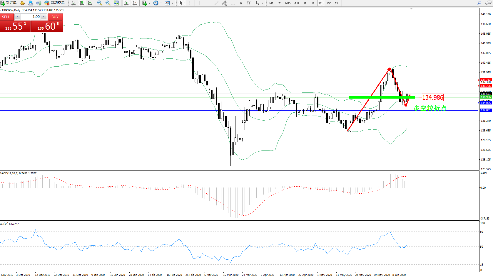交易策略:134.986上方看涨,目标136.756、137.733