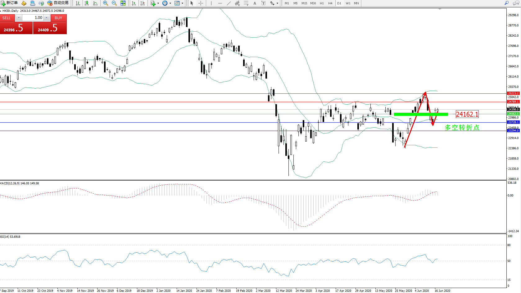 香港恒生指数6月17日(周三)收盘上涨137.32点,涨幅0.56%,报24481.41点;亚太股市涨跌互现,香港股市整理,市场炒股不炒市,聚焦科技股。美团今日再创上市新高,医药股、抗疫概念股大涨,百信国际涨超17%,康哲药业涨超10%。港股市场回暖的主要原因在于先前机构投资者所担忧的海外不确定性在短期内出现缓和,包括美欧复工后尚未见到大规模二次爆发;欧美失业改善情况好于预期;地缘政治风险的实际暴露低于之前机构投资者的预期;这些因素使得部分投资者回补仓位,亦加大了港股市场反弹力度。港股延续强势,并沿上升通道挺进,但上方压力开始浮现,由于累积较大获利需求,短线大盘或需进行休整,但预计行情整固过后,港股仍将延续上行趋势,投资者可根据自身仓位适度调整持仓水平。