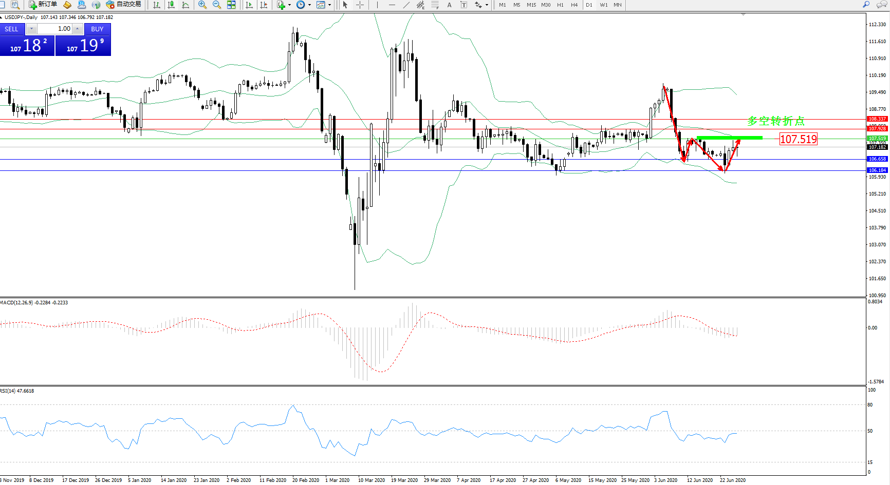 交易策略:107.519下方看跌,目标 106.658106.184