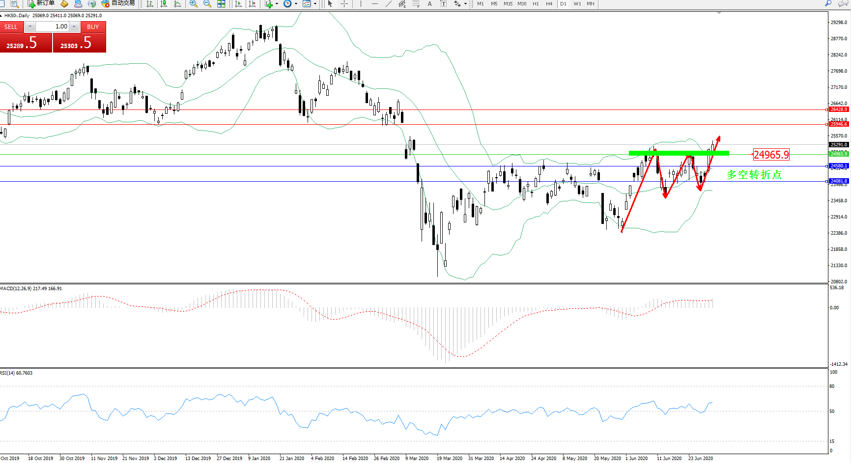 香港恒生指数7月3日(周五)收盘上涨248.93点,涨幅0.99%,报25373.12点;港股延续昨日强势上涨行情,恒指午后一度升至1.3%创下近4个月新高,国指涨1.85%报10243点。南下资金大幅流入50.03亿港元,大市成交额为1639亿港元。港股恒指本周涨3.55%,自3月低点累涨超20%,步入技术性牛市,至此,港股三大股指全部步入技术性牛市。恒指6月的止跌给7月的行情带来了积极信号,对于7月行情可以积极看好,恒指再度冲击年线26140点值得期待。中资券商股继续大涨,光大证券飙涨超26%,两日暴涨超50%,招商证券、中信建投均大涨超14%;手机概念股亦全线走强,瑞声、舜宇均大涨超6%;美团点评涨近7%,市值突破1.1万亿港元;腾讯收涨1.16%,市值站上5万亿港元。