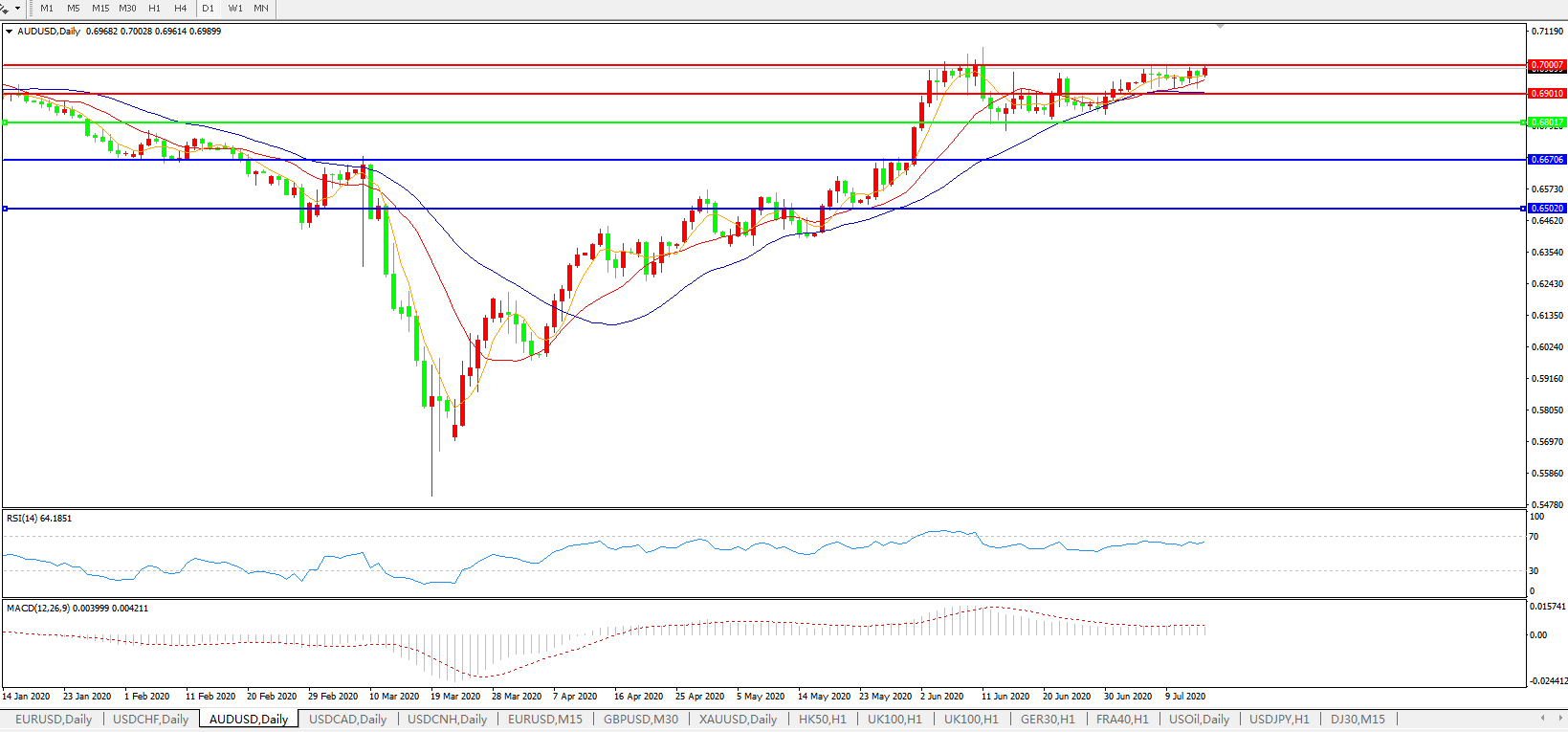 技术面简析:日图均线维持发散上行态势,汇价整体呈整理态势,MACD运行于0轴上方但量能小幅缩量,RSI走平,预计汇价短线大概率将继续整理,关注0.7000 关口压制。