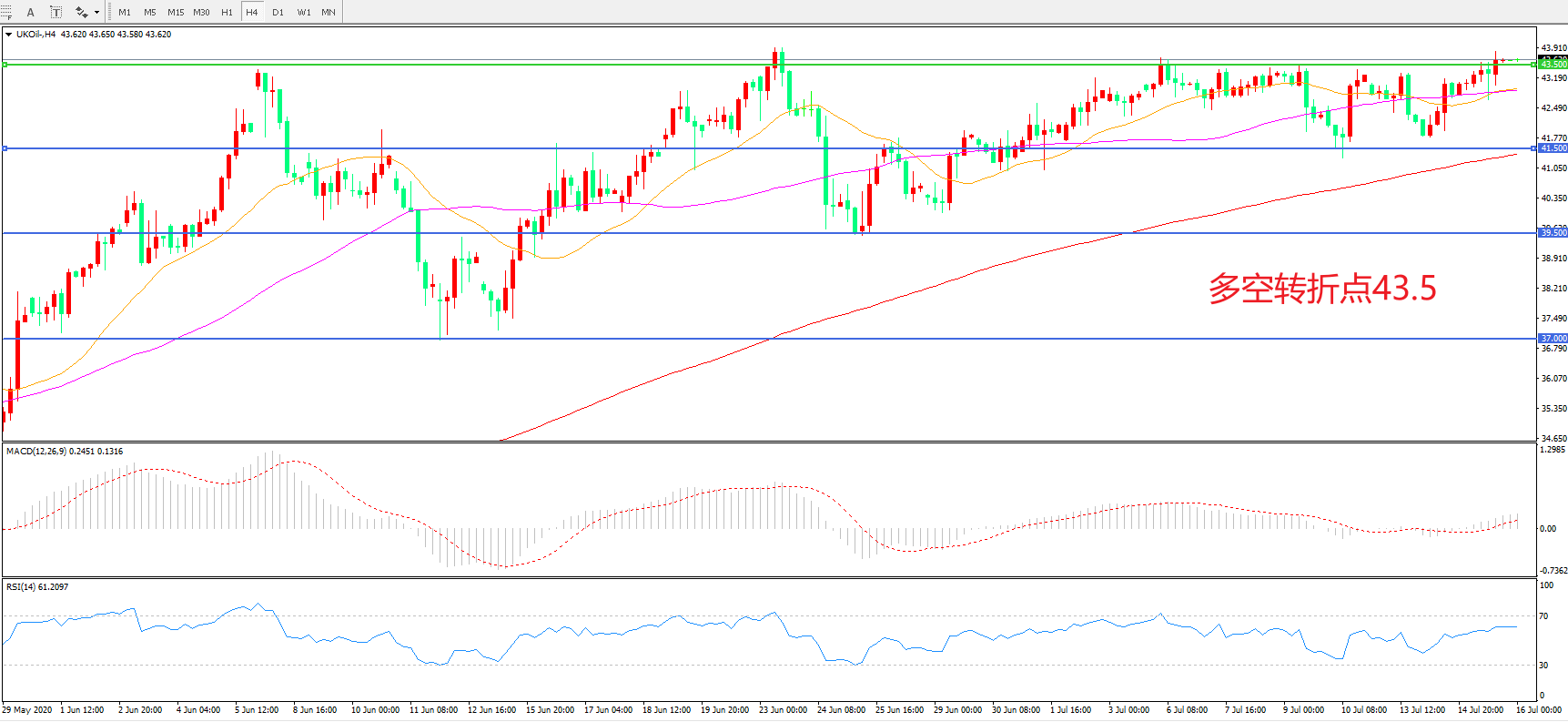 4小时图看,油价震荡反弹,短期表现偏强,43.5美元阻力被突破,均线系统形成金叉,MACD红柱增加,RSI指标走平,日内延续上行概率较大。
