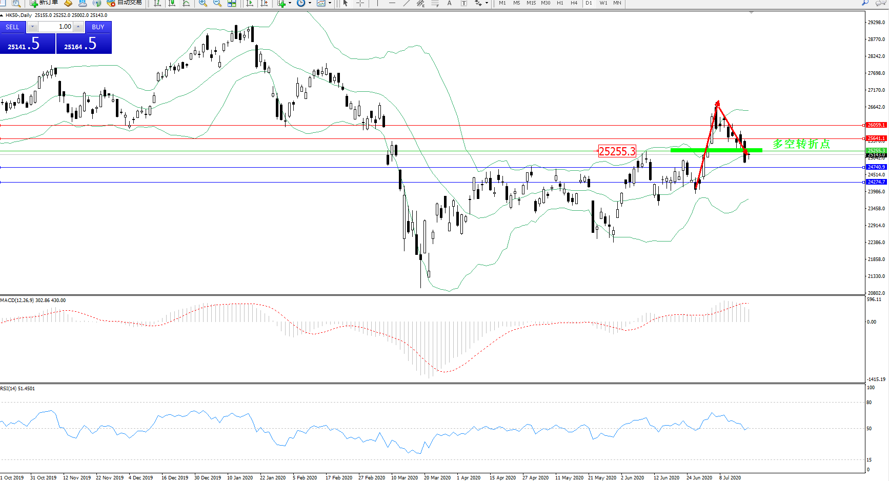 技术点评:多头动力延续布林带指标上轨强势拉升上扬后,遇阻呈倒V型邹走势回撤至布林带指标中轨附近弱势整理中,布林带指标呈收口走势持续中,该位正是前期关键多空分水岭位置节点,短期或将维持整理数日,MACD指标处于多头区域高位弱势整理回撤走势中,RSI指标处于多头区域弱势整理回撤至50均衡线附近持续徘徊中;