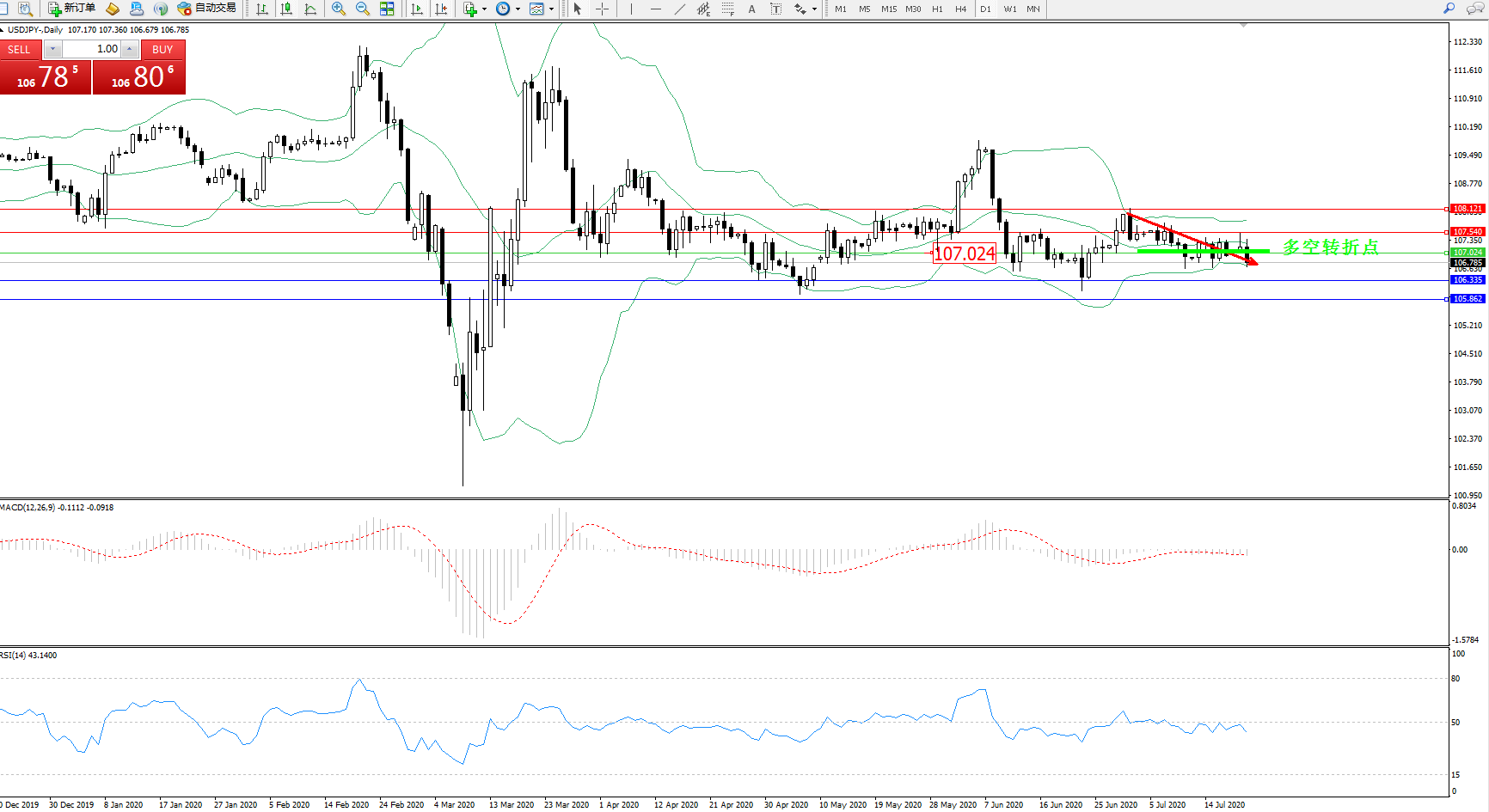 美元兑日元跌0.44%至106.80;从106.69的新一周低点回升,但仍保持在106.00-108.00区间内。美元兑日元在周一早盘一度触及一周半高位107.52之后再度陷入区间震荡走势,这一状况还会继续延续相当一段时间,原因在于美元走势前景及全球风险情绪存在不确定性,导致避险日元的走势前景同样上下两难;一方面美国和日本本土当前都受困于疫情的第二波爆发,另一方面疫苗研发又不时又乐观消息传出,这令市场情绪相对纠结,美元和日元因此仍受避险情绪起伏陷于同步进退状态,至少在下周美联储政策决议给出未来进一步的政策指引前,这一趋势或还会继续延续下去。