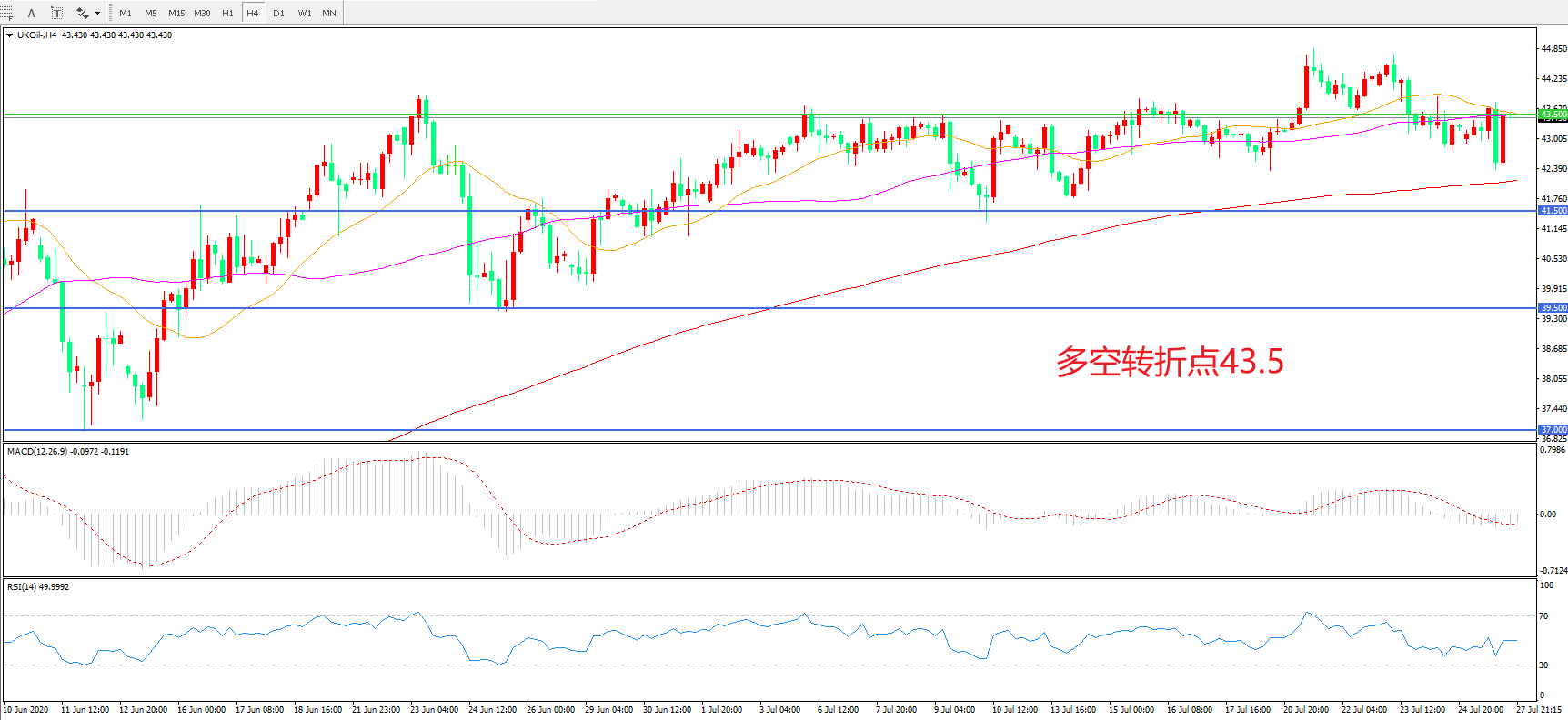 周一(7月27日),因中美贸易冲突持续升级,市场避险情绪高涨,油价一度大幅下挫,但市场对美国刺激措施的十分看好,布伦特原油先跌后涨,收报43.48美元/桶。多空因素交织之下,市场将会重新将注意力转移到EIA原油数据上,以寻找新的交易动力。