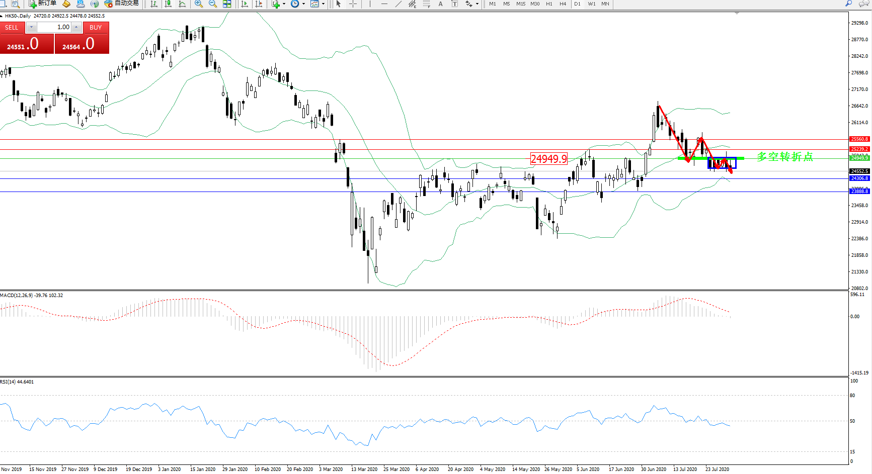 香港恒生指数7月31日(周五)收盘下跌115.24点,跌幅0.47%,报24595.35点;港股三大指数冲高回落明显,市场情绪疲弱。香港银行股、石油股走低明显,澳优绩后大跌超10%。恒指成份股中,瑞声升近4%居首,港交所涨超2%,中海油、中石化均跌超2%拖累大市走低。今日南下资金净流入38.18亿港元,大市成交额为1191亿港元。7月收官,恒指月涨0.69%,国指月涨2.88%。香港特区政府卫生署卫生防护中心传染病处主任张竹君表示,截至今天凌晨0时,香港新增121例新冠肺炎确诊病例,连续10日新增确诊病例数破百,其中包括118例本地确诊病例和3例输入性病例。累计确诊病例增加至3273例。