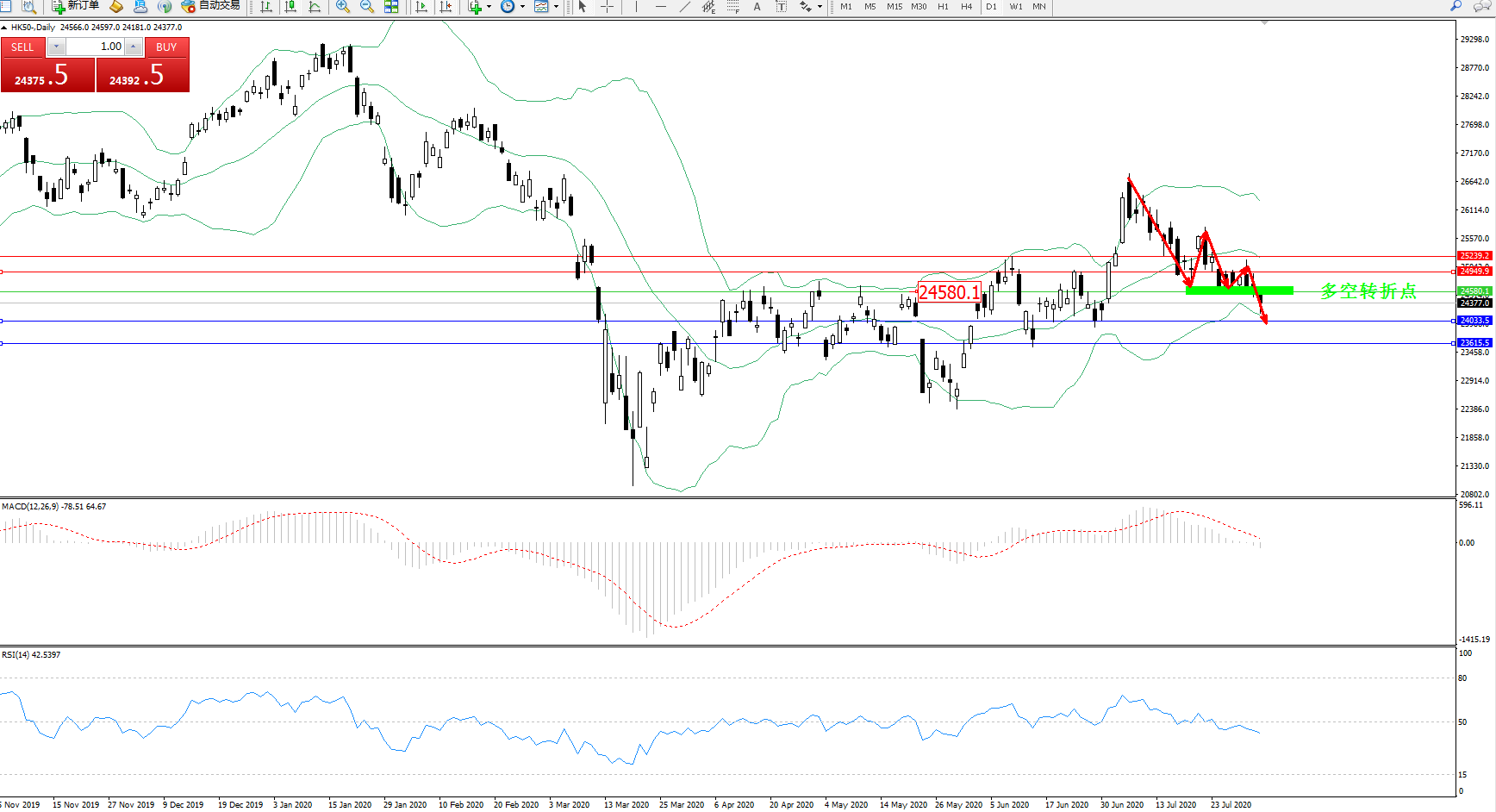 技术点评:高位空头动力维持震荡下移趋势持续中,日内抵达布林带指标下轨附近节点后出现短暂回升走势,但下行趋势已然形成,有进一步回撤下移态势,布林带指标呈张口走势后开始收口走平,且有转势向下移动态势,MACD指标空头动力持续弱势下移至0轴附近持续徘徊后破位下行,RSI指标长时间纠结于50均衡线附近整理后终究破位进入空头区域徘徊下移;