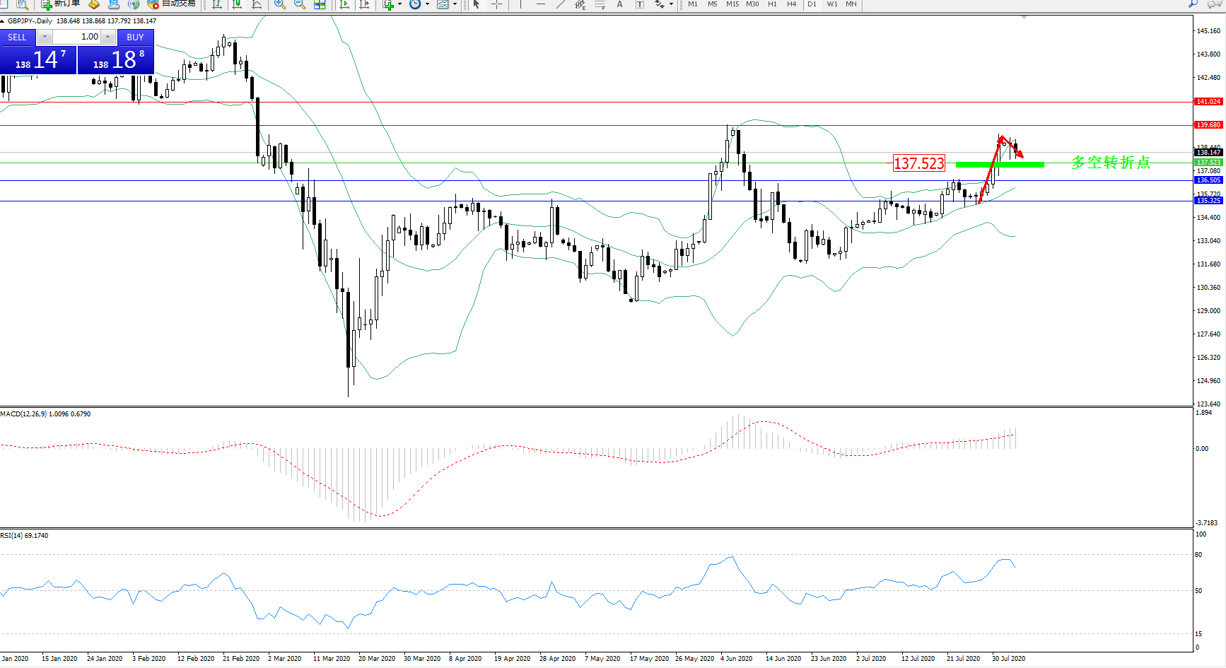 英镑兑日圆纠结于138.181附近徘徊,富时100指数2020年展望:新冠疫情与英国脱欧后谈判的双重困境;受新冠疫情危机与英国脱欧后的谈判相结合的影响,使富时100指数的前景更加复杂,公允价值预期从上涨24%到下跌34%不等;2021年的盈利前景是关键,最好将该指数分为国际、国内和大宗商品板块,密切关注英镑和布伦特原油;周期性股票应该领先,但需要超越银行和能源行业的挑战。美国银行预计英国央行将于11月把利率下调至0%,英国央行将在11月增加1000亿英镑的资产购买。因美元筑底行情仍在延续,近日美国疫情稍有缓和的消息阻息了美元指数继续下行,也令镑系货币出现短线头部形态。在美国ADP就业数据于周三公布之前,预计美元的超跌反弹趋势还会延续,并带动非美货币走低。