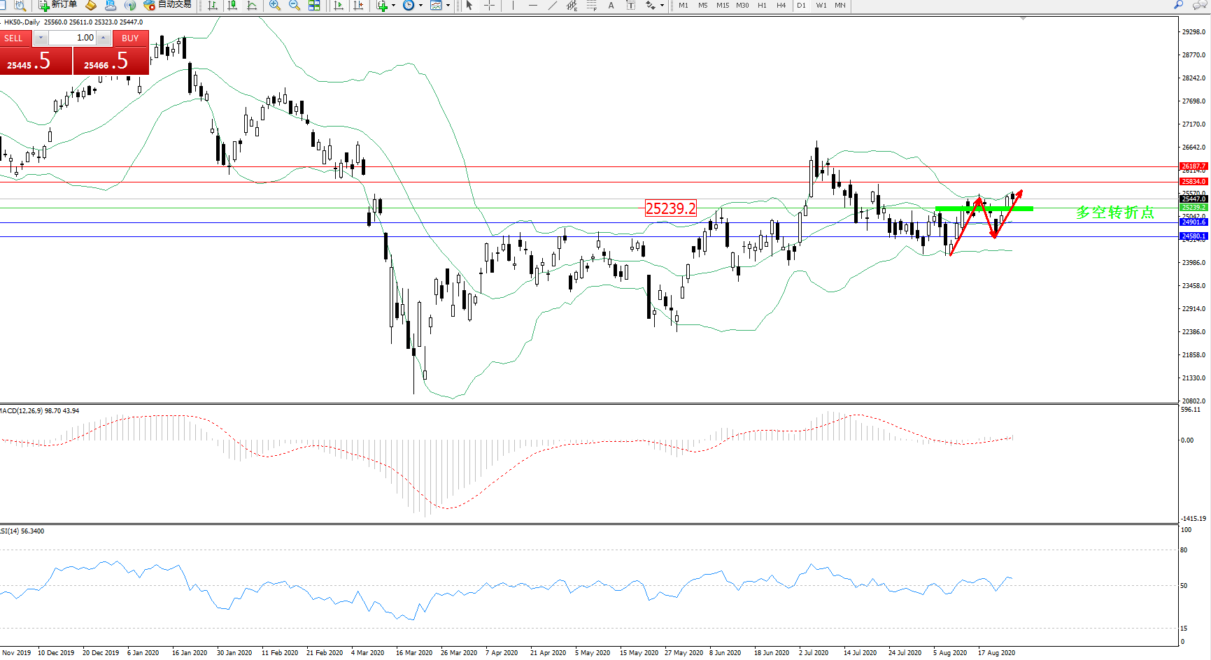 香港恒生指数8月25日(周二)收盘下跌65.36点,跌幅0.26%,报25486.22点;港股三大指数均弱势下跌,市场情绪低迷。恒指盘中一度跌至0.8%,尾盘回升明显,阿里概念股与手机概念股全线下挫,瑞声大跌超7%,舜宇亦跌近5%;大型科技股涨跌不一,阿里涨近2%,美团跌3%,腾讯小幅收跌。今日南下资金净流入23.1亿港元,大市成交额为1287亿港元。 蚂蚁集团分别向上交所科创板和香港联交所递交上市招股申请文件,内容显示,马云将从其个人所持蚂蚁股份中捐出6.1亿股用于公益。这些捐赠将委托杭州云铂未来捐赠给他指定的公益组织,按蚂蚁招股书显示的上市后总股本300.3897亿股计算,马云此次相当于捐出了蚂蚁(上市后)股份的2%。蚂蚁集团表示,公司积极参与数字人民币研发试验,数字人民币何时正式推出没有时间表,尚难以评估该项工作对公司的业务、财务状况和经营成果的影响。数字人民币是人民币的数字化形式,定位于流通中货币(M0),不同于一般的电子支付工具。