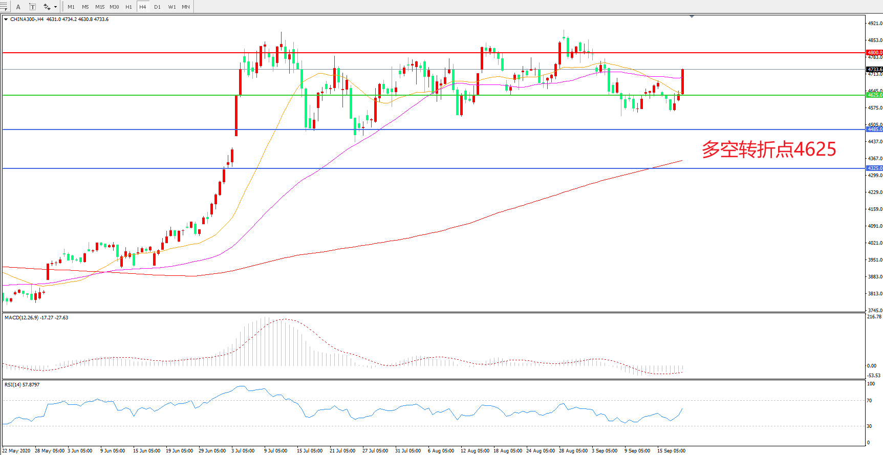 4小时图看,沪深300阳线大幅拉升,短期走势回暖,4625成为短期支撑,均线系统走平, MACD绿柱缩短,RSI指标向上,日内延续震荡概率较大。