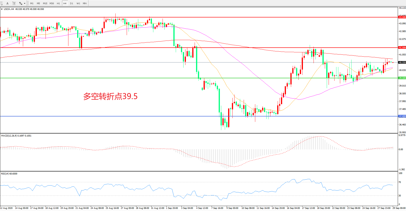 4小时图看,油价以39.5美元为依托震荡反弹,短期走势有所回暖,200均线成为上方主要压力,MACD红柱增加,RSI指标走平,日内延续震荡概率较大。