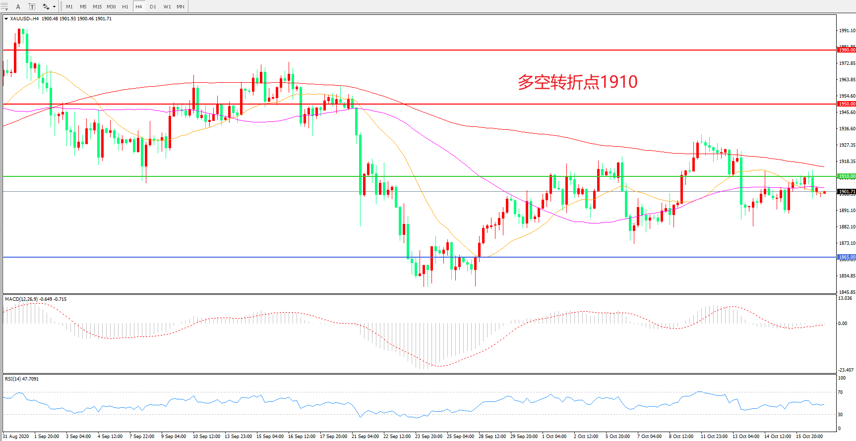 4小时图看,金价延续低位震荡,1910成为短期多空分水岭,均线系统走平,MACD红柱增加,RSI指标走平,近期延续震荡概率较大。