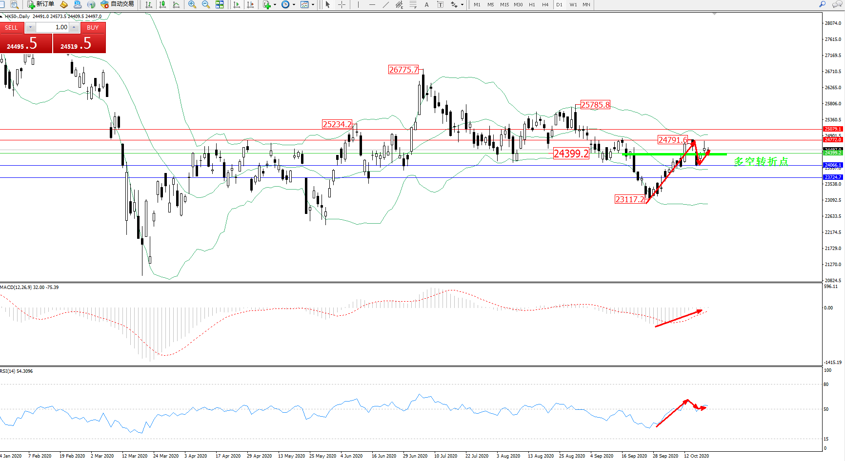 技术点评:低位多头动力持续震荡上移至布林带指标通道中上轨区间震荡平移,布林带指标呈张口平移走势态势良好,低位多头有继续回升态势,关注中上轨区间关键转折点,MACD指标空头区域低位震荡回升至0轴线附近整理平移中,RSI指标多头动力震荡上移至50均衡线附近持续宽幅整理平移中;