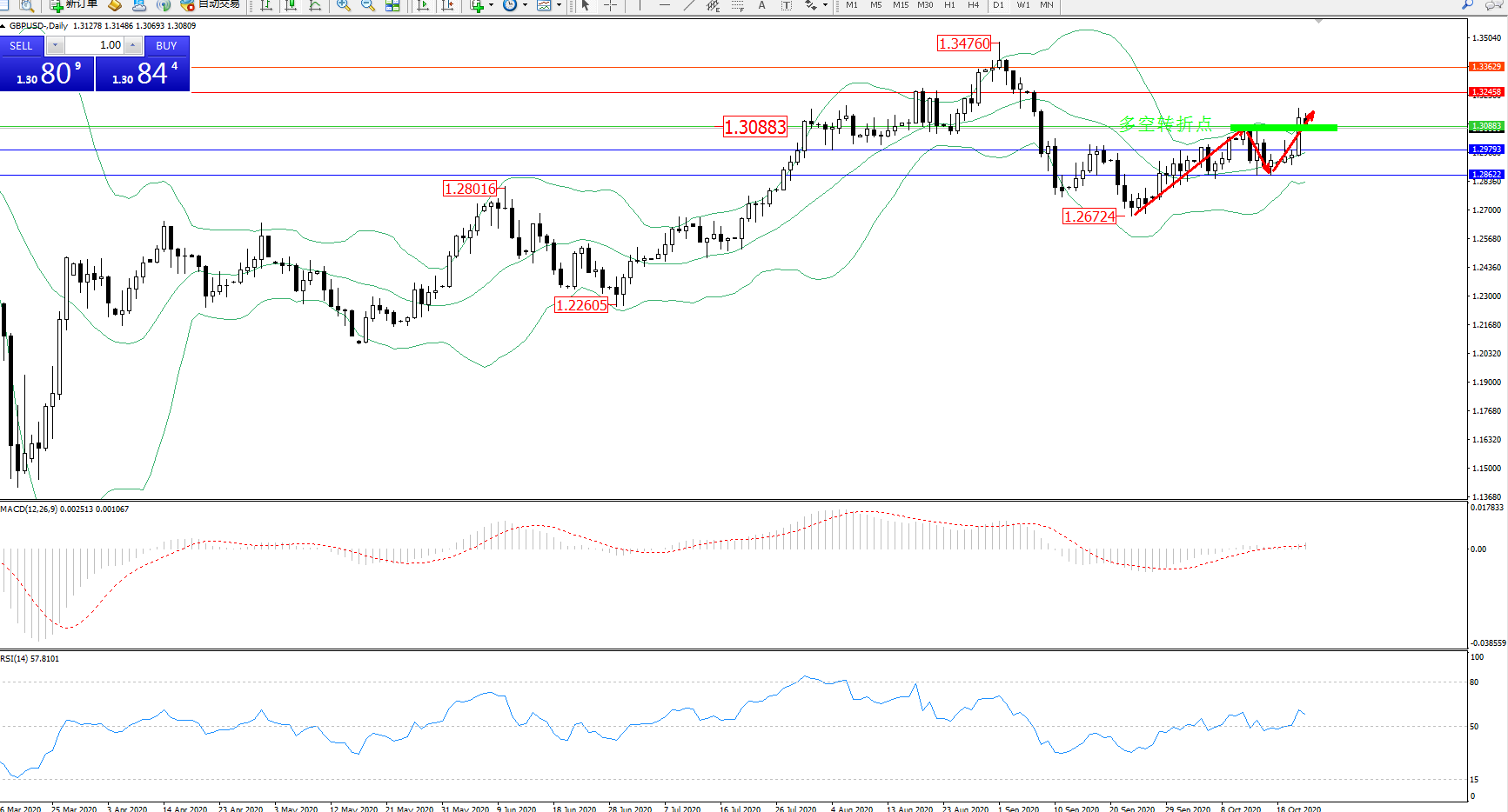 英镑兑美元处于1.3083整理;有消息传出,英国和欧盟将恢复正式贸易谈判,以期在11月中旬达成协议。英国和欧盟两国同意恢复正式谈判,旨在于11月中旬达成协议。然而,双方在最棘手的问题方面仍然存在很大差距,达成协议的机会仍很小;周四焦点将是英央行会议,英央行数位官员将发表讲话,包括英央行行长贝利的发言。央行对于货币政策的态度及取向将会对英镑产生较大的影响,须密切留意;在英镑已经突破了此前的盘整区间之后,脱欧问题乐观消息面背景下上行趋势已成,在美国大选投票日来临前美元可能继续承压的背景下,英镑汇价后市料将进一步积蓄动能。