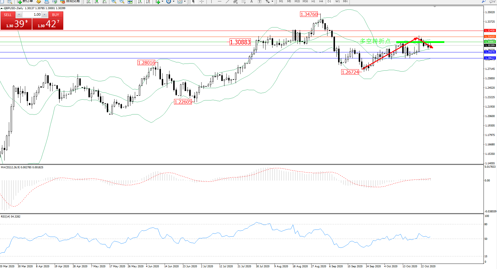 交易策略:1.30883下方看跌,目标1.29470、1.28622