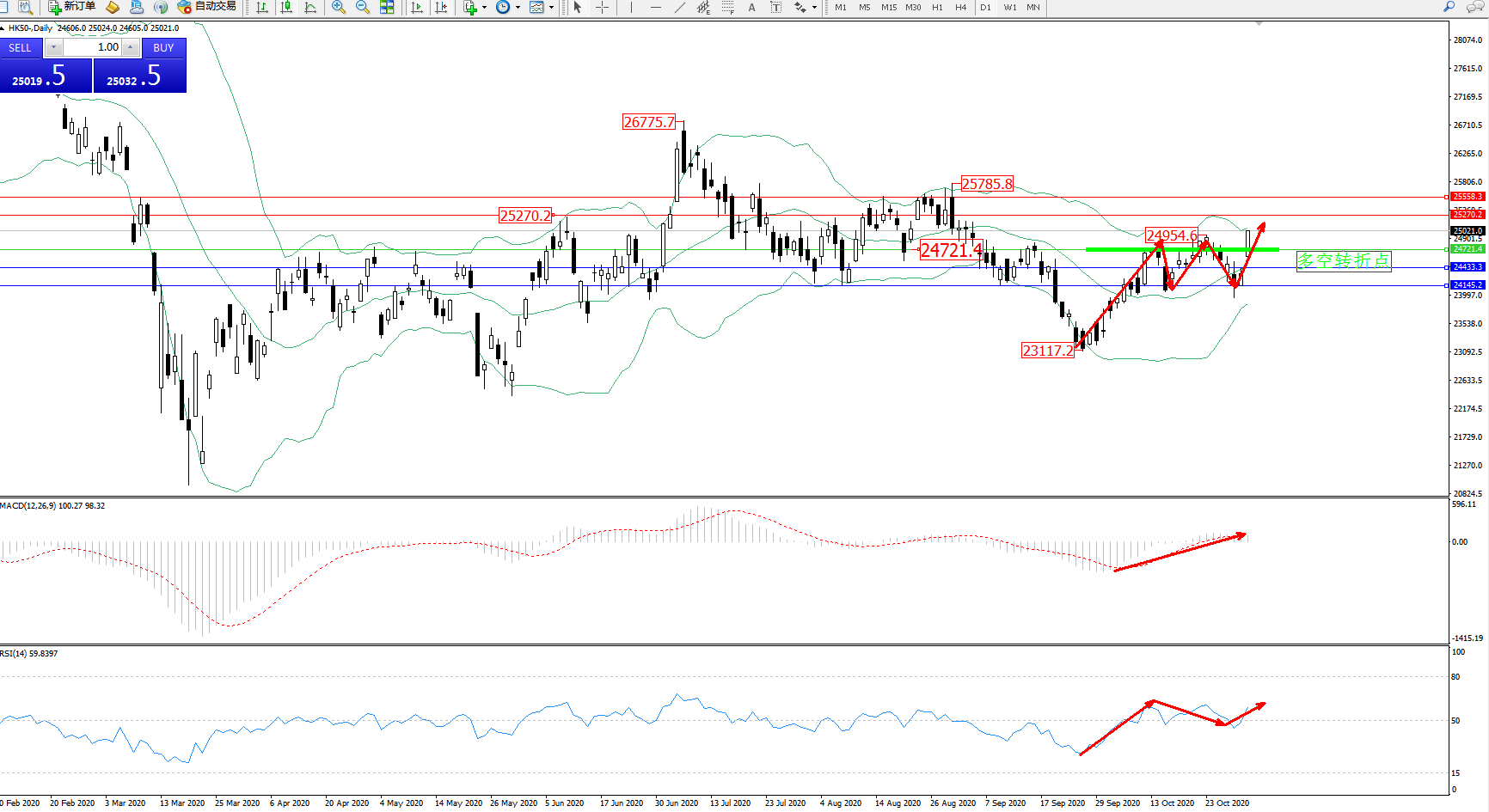 香港恒生指数11月3日(周二)收盘上涨479.72点,涨幅1.96%,报24939.73点;港股市场延续上涨行情,主要指数均大幅收涨。恒指盘中一度站上25000点,恒生科技指数涨1.7%。香港9月零售货值跌幅收窄,香港本地股全线走强;保险股、银行股、石油股持续活跃,助力大市走高;电池股、光伏股回落明显,手游股延续跌势。今日南下资金净流入77.46亿港元,大市成交额为1296.32亿港元。港股四季度中后期有望开启由盈利驱动叠加风险偏好修复的“戴维斯双击”行情。欧美疫情二次爆发,中国出口份额持续加速。建议关注顺周期行业;科技创新、先进制造、以及环保新能源概念企业;国内大循环下的内需消费替代。新经济纳入叠加低估值优势,港股配置价值凸显。当前AH溢价指数正处于近四年以来的高位水平,与此同时,恒生H股指数估值不足12倍,具有较高性价比。从全球几个主要股票市场横向来看,恒生H股指数市盈率最低,其滚动市盈率甚至比15倍的沪深300还低。不断流入香港市场的南向资金在一定程度上也反映了对港股的认可。