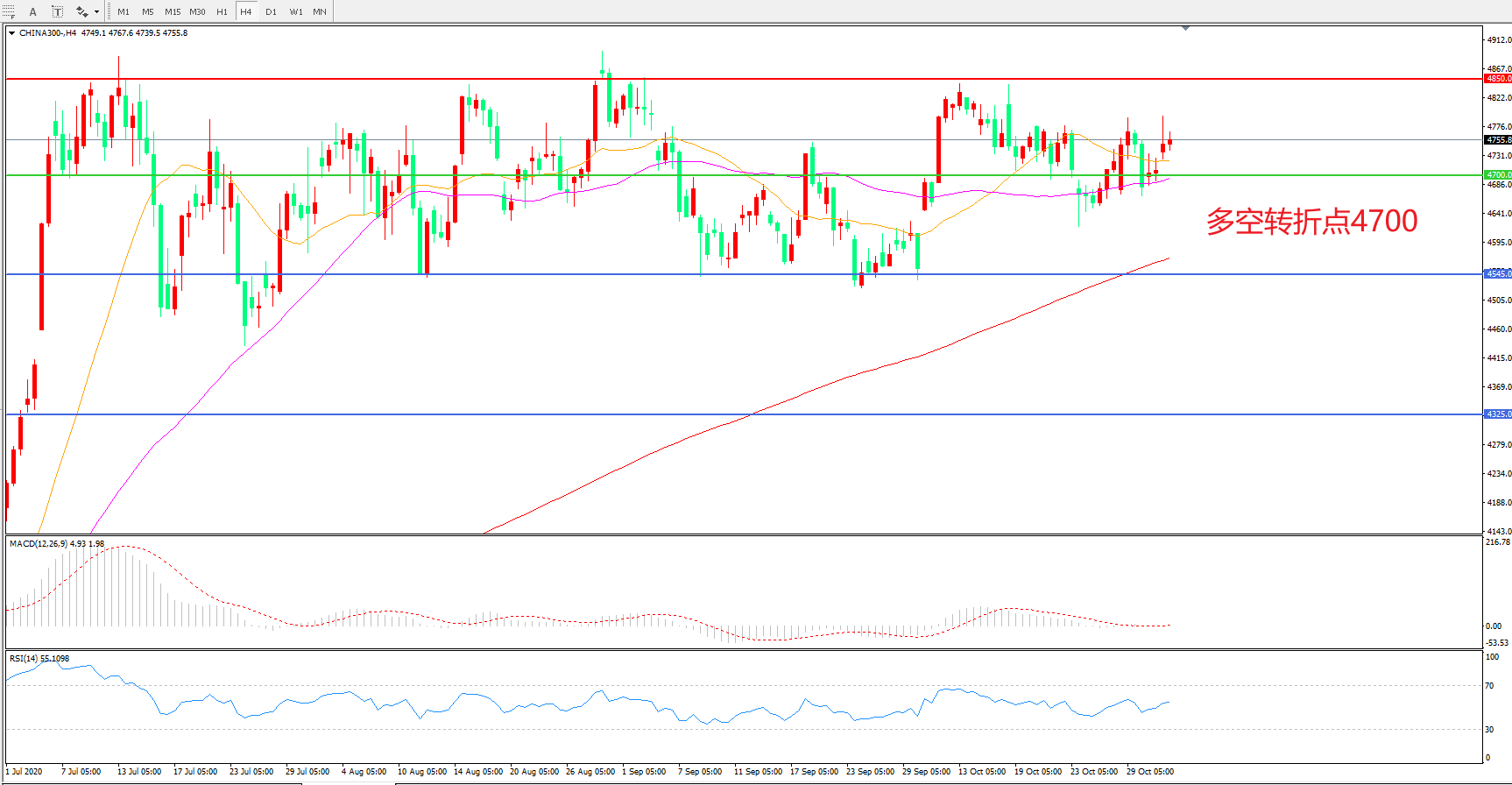 4小时图看,沪深300震荡上行,短期走势有所回暖,21周期均线成为短期支撑,MACD红柱缩短,RSI指标向上,日内延续上行概率较大。