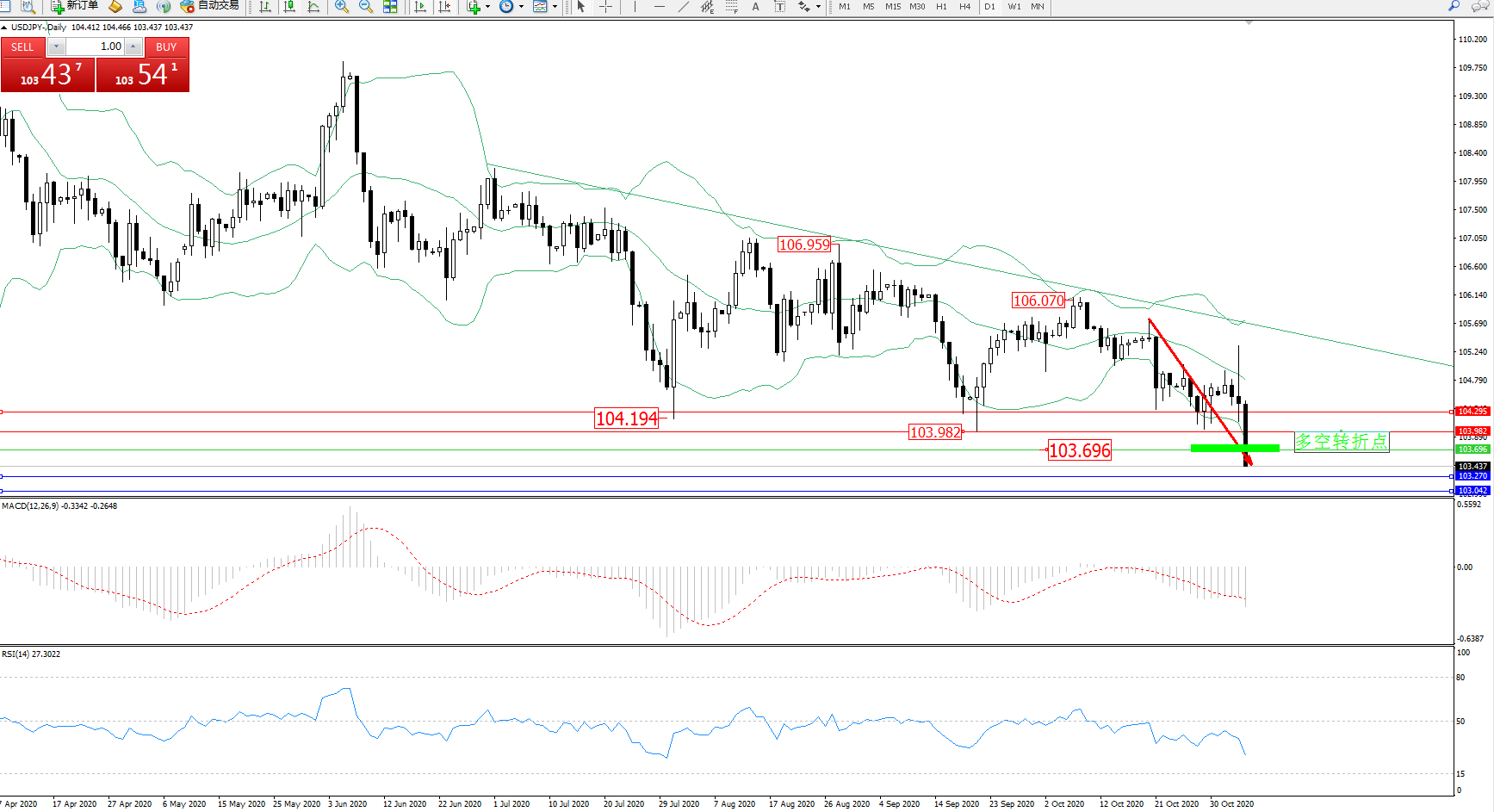 交易策略:103.696下方看跌,目标103.270、103.042