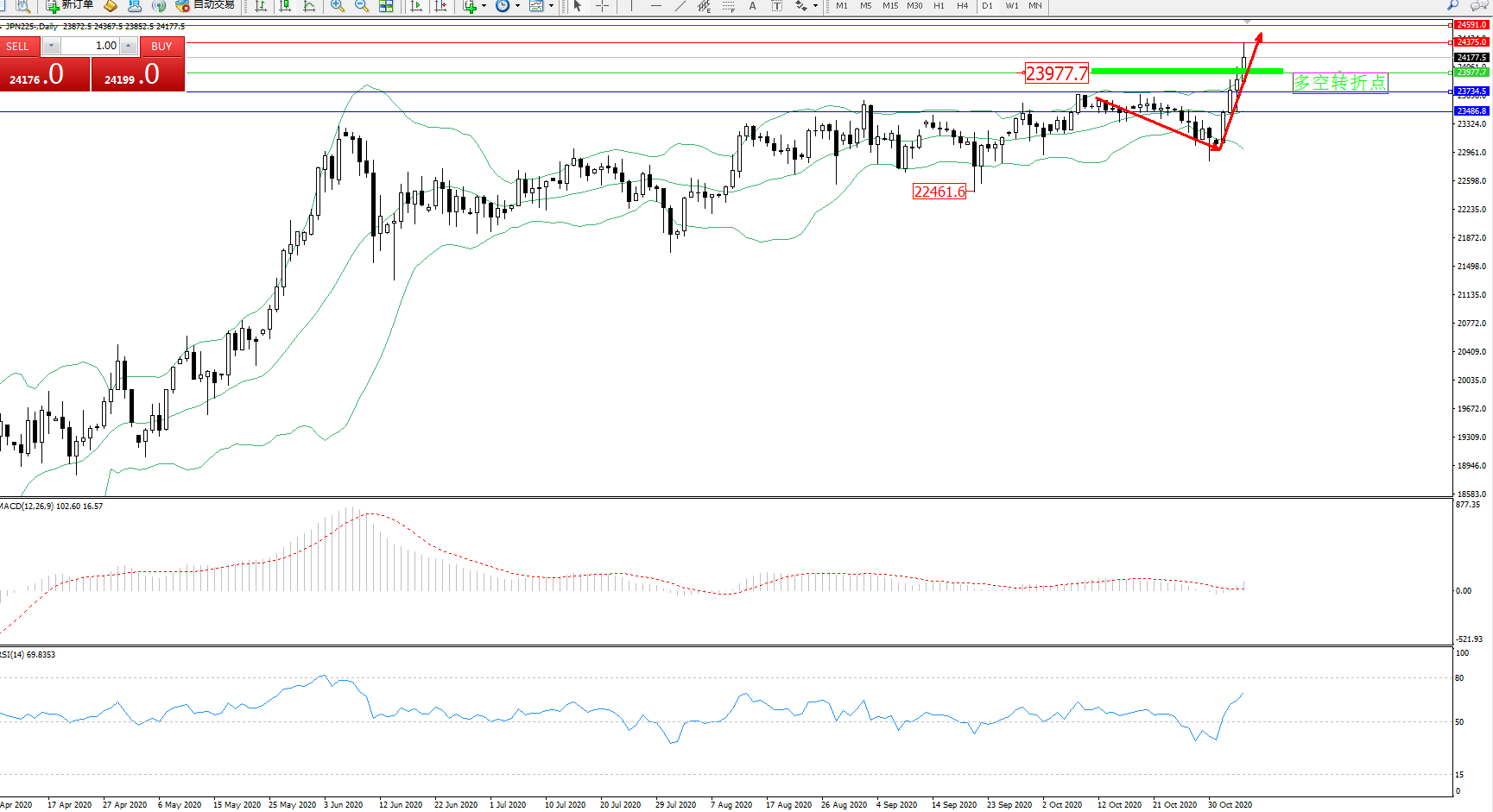日经225指数11月5日(周四)收盘上涨452.77点,涨幅1.91%,报24148.00点。由于对美国大选结果保持谨慎的情绪占上风,随着投资者权衡在民主党候选人拜登小步向胜利靠拢之际,特朗普就大选结果发起的法律挑战,由于担心美国总统大选久拖不决,美国国债收益率承压。国会参众两院分属两党的预期将令通过大规模财政刺激措施更加困难,这也给美债收益率带来压力。日本央行行长黑田东彦:日本央行购买ETF是为了支撑经济和通胀。日本央行购买ETF不是为了拉升股票价格。ETF购买帮助稳定市场。现在未考虑调整ETF购买。购买ETF是为了避免风险溢价上升导致损害家庭和企业信心。ETF购买是超宽松政策的一部分,这是必要的。