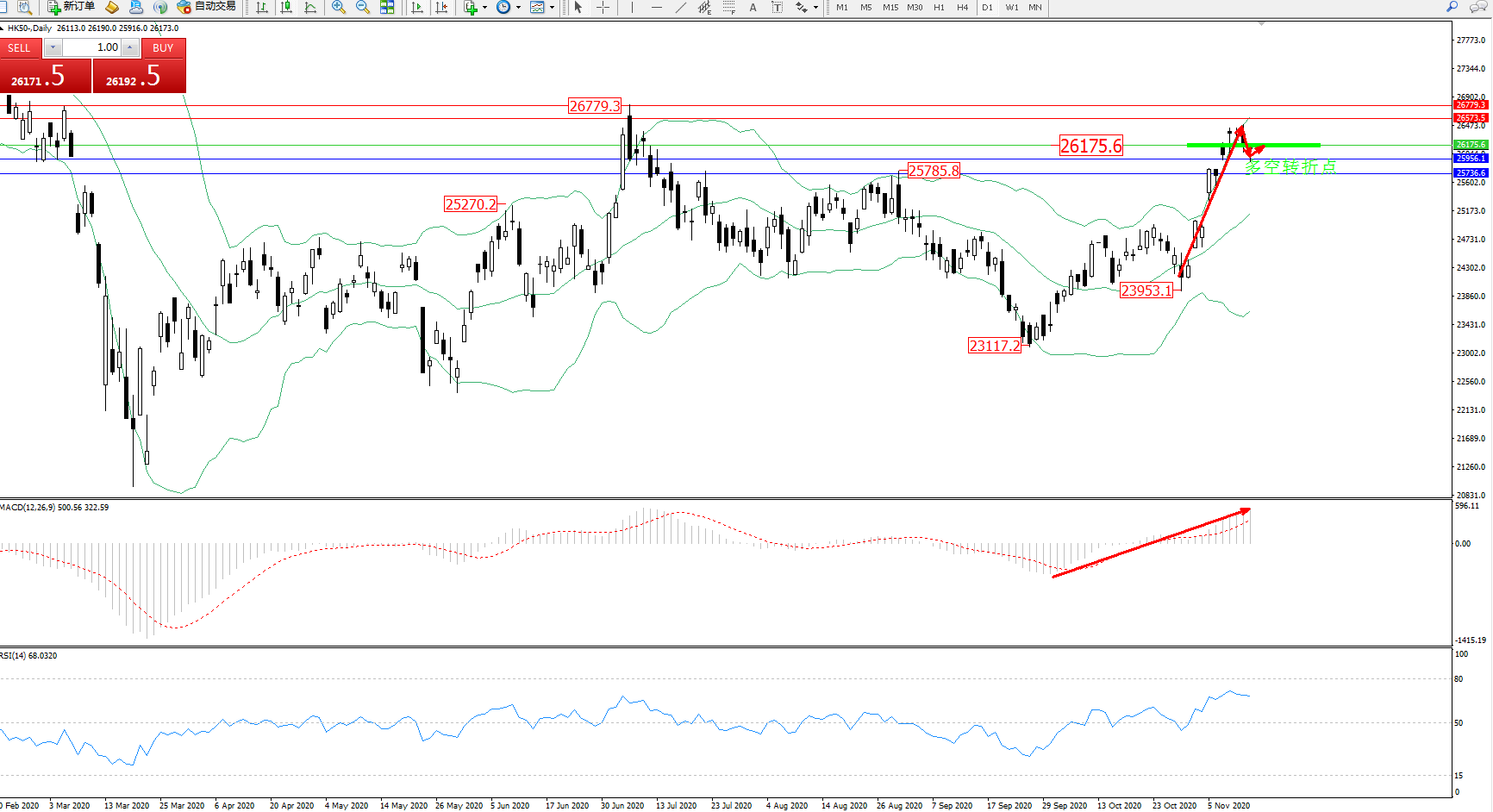 香港恒生指数11月13日(周五)收盘下跌12.52点,跌幅0.05%,报26156.86点;港股恒指低开震荡,尾盘拉升微跌,科技股强势,助力恒生科技指数大幅收涨3.03%。市场风格切换频繁,科技股依旧是市场焦点。近日科技股跌宕起伏,此前连续大跌2日,近2日又现强劲反弹,京东今日大涨近8%,美团大涨6.6%,腾讯、小米均升超4%;昨日高铁基建等周期股崛起,消息称美国禁止投资有助于中国军事发展以及相关联公司,电信股应声大跌,中国电信大跌近8%;中资券商股、石油股、银行股全天表现弱势。今日南下资金净流入43.69亿港元,大市成交额为1514.07亿港元。2021年港股将迎来久违的指数牛市。经济复苏、价值重估,有利于目前价值股占比大的恒指、恒生国企指数;港股性价比好于A股和美股。港股恒生指数和恒生国指正发生脱胎换骨的进化。随着指数编制规则的改变,预计恒生指数的行业市值结构在三年内将可堪比标普500指数。