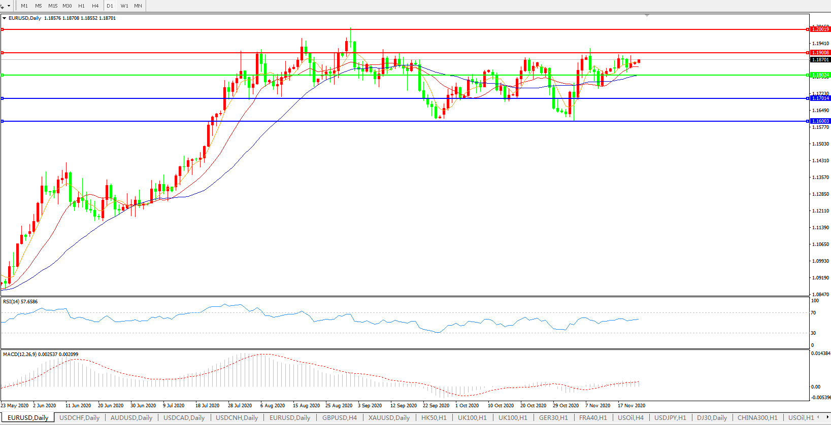 美元指数在周五日内陷于震荡,投资者仍一方面在焦虑不安地关注美国财政援助措施在年底到期后的前景,一方面则又在瞩目辉瑞等公司疫苗紧急提交上市应用申请的前景,同时欧洲与亚太市场还有更多官员对经济及货币政策释放不同的预期,因此汇价在日内出现反复震荡,但波动幅度却仍相对受限; 而业内分析师指出,在消息面陷入拉锯的状况下,美元指数短线横盘波动的趋势还将延续,上周高点93.20仍是当前的强阻力位,而支撑位在日内低点92.30,跌破后可能下踩9月份的低点91.74。在美国大选结果迟迟不明朗,而财政协议也因而悬而未决的大背景下,美元近期确实将难以有效破位反弹