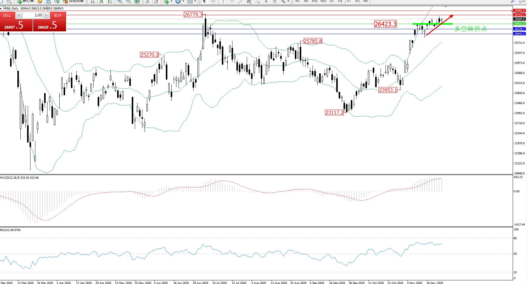 香港恒生指数11月24日(周二)收盘上涨102.00点,涨幅0.39%,报26588.20点;港股主要指数收盘涨跌不一,恒生科技指数涨0.23%。恒生科技股涨跌各半,蓝筹股港交所大涨近4%逼近新高价,市值逼近5000亿港元,沪港深改革提速。今日南下资金净流入33.47亿港元,大市成交额为1432.42亿港元。中国香港10月贸易帐逆差368亿港元,预期逆差125亿港元,前值逆差127亿港元。据港媒,香港新冠肺炎第四波疫情恶化,特区政府收紧防疫措施,食物及卫生局局长陈肇始今日公布,自26日起,所有酒吧、酒馆、浴室、派对房间及夜店等场所须暂时关闭,会址将禁止现场表演。另外,宴会限最多40人参与,以每桌4人计算,即最多10桌。相关措施将持续到12月2日。据香港电台消息,香港特区卫生防护中心传染病处主任张竹君表示,11月24日新增新冠肺炎确诊案例80例,是继23日73例确诊病例后,再达超三个月(8月16日)以来单日新高。其中,本地病例69例。