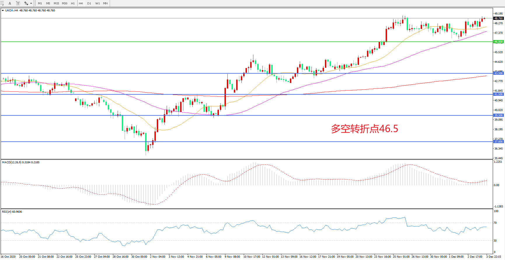 周五(12月4日),OPEC大会结果出炉!会议最终结果为2021年1月开始阶梯式增产,不及此前市场预期,但由于本周OPEC+会议推迟两日结束且谈判过程略显艰难,市场已对即将增产有所准备,布伦特原油延续震荡上行,收报48.76美元/桶。