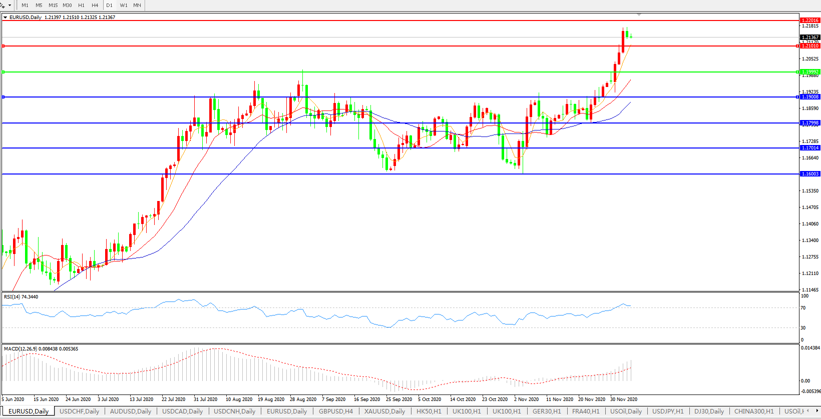 技术面简析:日图均线呈有序多头排列,汇价大幅冲高后小幅回落,MACD运行于0轴上方且量能0轴上持续放量 ,RSI超卖区域小幅走弱,预计短期汇价大概率将在整理后进一步上行。