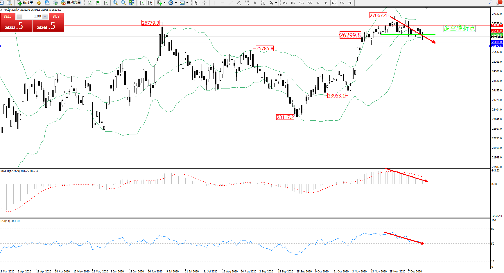 香港恒生指数12月15日(周二)收盘下跌182.23点,跌幅0.69%,报26207.29点;恒指收跌0.69%,本地地产股普跌,科网股持续受压;汽车股、苹果概念股午后发力冲涨.港股主要指数全日表现疲弱,市场情绪较为低迷。恒生科技指数跌0.42%。苹果计划明年上半年将iPhone产量提升30%,苹果概念股午后拉升明显;半导体板块大幅下挫,濠赌股、军工股、香港本地股全天弱势。大型科技股多数下跌,美团、京东跌近3%,阿里、腾讯均下跌。今日南下资金净流入19.85亿港元,大市成交额为1440.07亿港元。据港媒,香港特区政府卫生署卫生防护中心12月15日下午表示,香港新增98例新冠肺炎确诊病例,其中89例为本地病例,30例源头不明。