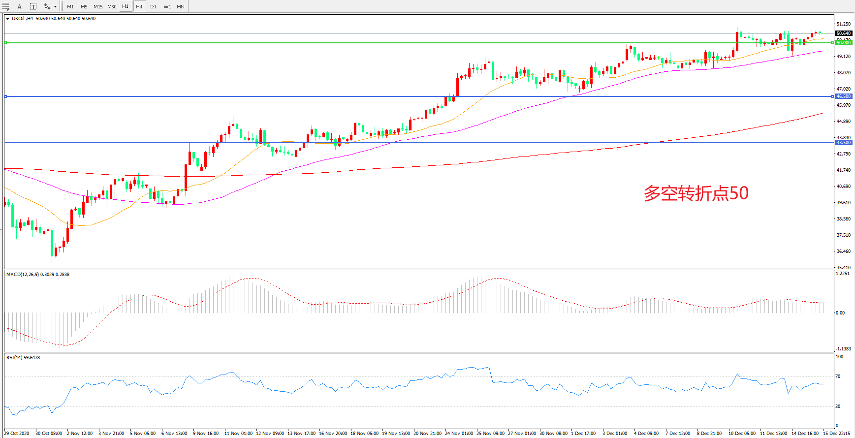 4小时图看,油价长阳后延续高位震荡,短期波幅不大,均线系统成为短期支撑,50美元成为多空分水岭,MACD红柱增加,RSI指标走平,日内延续震荡概率较大。