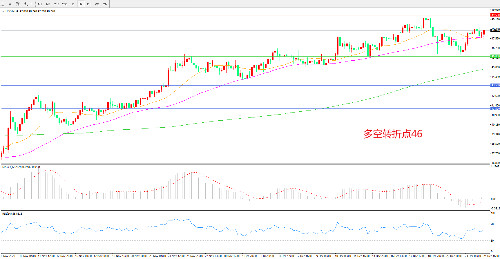周四(12月24日),由于临近圣诞假期,市场成交量和市场参与人数都有所下降,美国WTI原油在假日清淡交投中小幅走高,收报48.22美元/桶。自10月底以来,随着疫苗在许多国家获得批准,原油市场大幅反弹。目前在全球范围内,感染人数仍在增加,未来油价走势仍将受到疫情影响。今日,市场将因圣诞节假期休市一天。