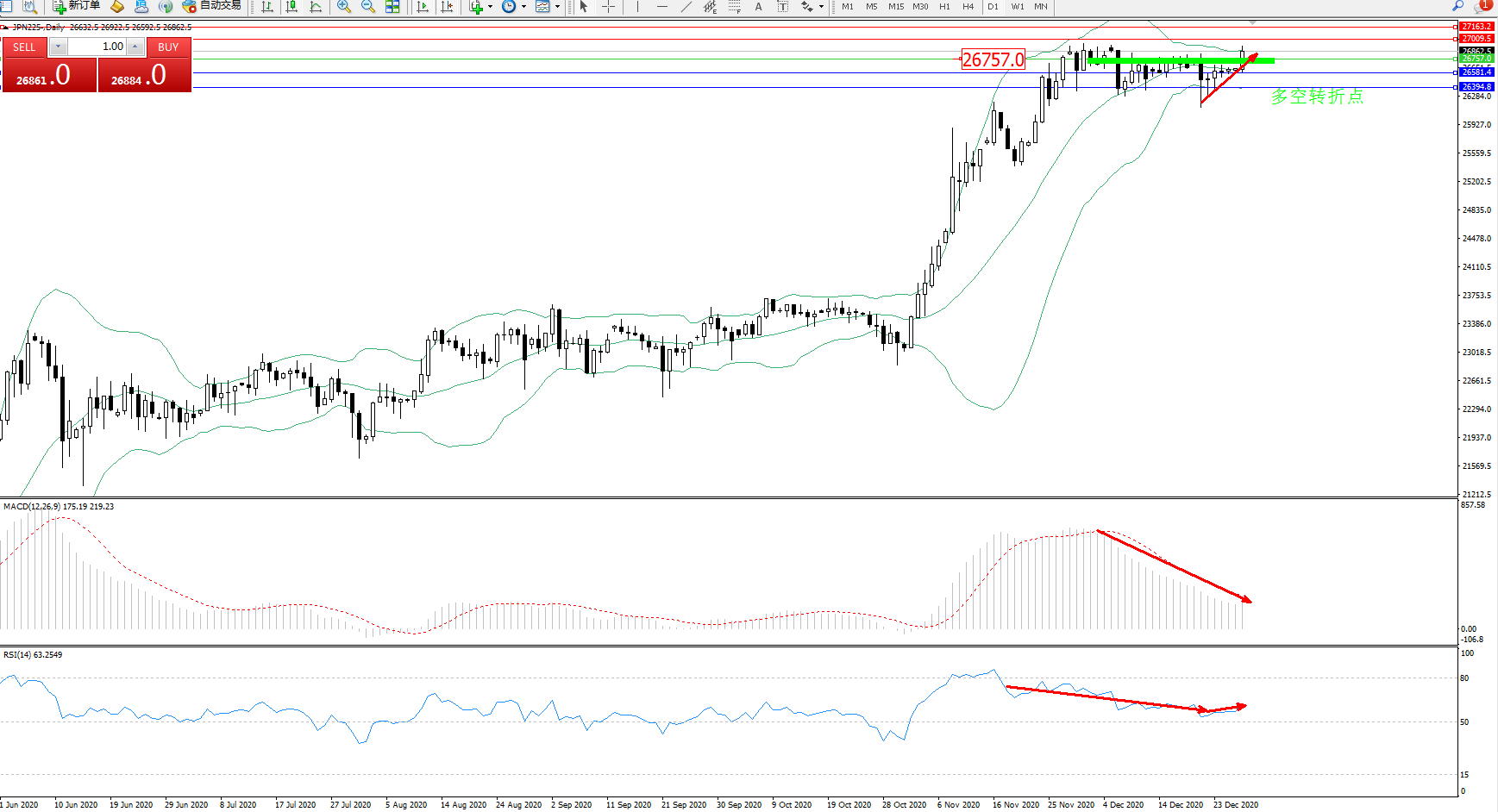 日经225指数12月28日(周一)收盘上涨178.65点,涨幅0.67%,报26847.00点。东京股市小幅反弹,创1991年4月17日以来新高;东京证券交易所股票价格指数上涨0.54%。东京股市两大股指当天小幅高开。美国总统特朗普签署新一轮纾困法案的消息缓和市场气氛。任天堂、迅销、软银集团等龙头股受投资者追捧明显上涨,拉动大盘大幅走高。至收盘时,两大股指均收于当日最高点位。日本政府此次“封国”决定看似突然,但实际上是为了有效应对疫情的必然之举。日本东京新增481例新冠肺炎确诊病例。防止变异新冠病毒的扩散,日本政府此次暂停所有国家和地区的新旅客入境,首先是为了防止传染性更强的变异新冠病毒在日本国内扩散。为重振因疫情而遇冷的经济,日本政府从10月开始放宽外国人入境限制。据日本出入国管理厅统计,11月约有6.6万人入境日本。然而,时下在英国、德国、新加坡等多国发现的变异新冠病毒,不排除有在日本国内大面积扩散的可能。日本厚生劳动省25日确认12月18日至21日间,5名从英国抵达日本的旅客被检测出感染了变异新冠病毒,这是日本国内首次确诊变异新冠病毒感染者。此后,日本国内26日又发现2名在机场检疫站以外地方确诊感染变异新冠病毒的患者。