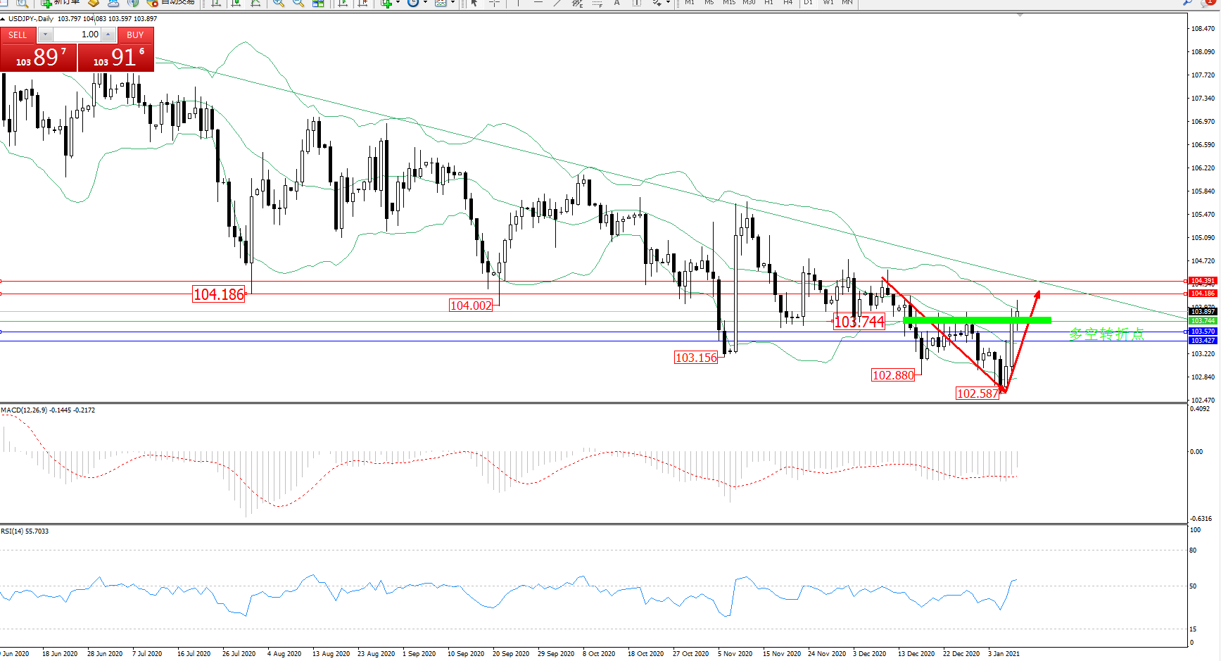 技术点评:空头动力延续布林带指标通道中下轨区间持续震荡下行至102.587位置后得到短暂支撑,多头动力伺机入场,强势反转拉升上扬,触及布林带指标上轨附近节点后开始高位震荡中,纠结于上轨附近持续徘徊,多头动力有急速拉升上扬态势,下行趋势正试图被破位中,MACD指标处于0轴线下方空头区域维持整理后缓慢回升中,RSI指标处于空头区域底部空头区域持续整理后多头动力伺机入场强势拉升突破50均衡线上方后开始徘徊;