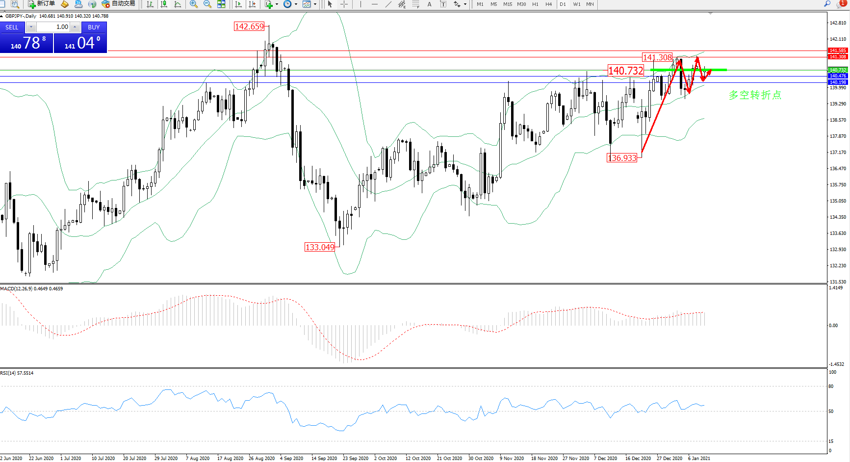 技术点评:多头动力延续布林带指标通道内中上轨区间持续震荡上扬中,高位已然长时间维持在中上轨区间持续整理,前期高位141.308位置短期触及后缓慢回撤,布林带指标呈收口走势后有上移态势,MACD指标处于0轴线上方多头区域维持整理平移中,RSI指标处于50均衡线上方持续徘徊后有继续向上移动迹象;