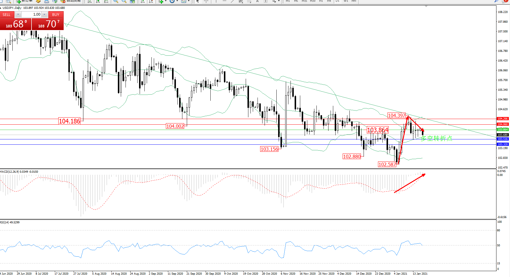 技术点评:空头动力延续布林带指标通道内持续震荡下行至102.587位置后得到支撑开始强势反转拉升上扬,高位抵达104.397位置遇阻回撤,空头动力伺机再度入场下行,处于布林带指标通道中上轨区间持续震荡中,关注中上轨区间关键节点,布林带指标呈缓慢张口走势中,MACD指标处于空头区域弱势震荡上移至0轴线上方附近徘徊,RSI指标低位多头动力上攻至50均衡线上方持续震荡整理中;