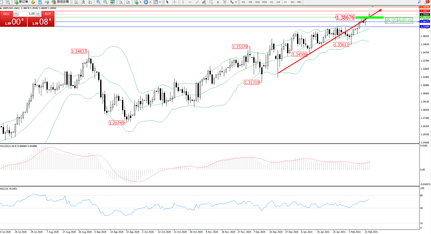 交易策略:1.38676上方看涨,目标1.39377、1.39798